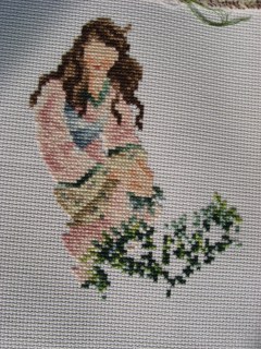 It doesn’t seem like it, but there are a million different colors in that basket of flowers. This is a Stoney Creek pattern so they like to use a lot of colors in order to add detail. It looks nice when it’s done, but it’s a pain to stitch because there are four stitches of one color here and maybe two over there. I have some backstitching that I’m doing on the basket, but I can’t completely backstitch the basket until I have done the wings. I’m not looking forward to them because it’s going to be white and various shades of white/ecru to make up the wings. Then I’m going to go back over it with the blending filament to make them shimmer. It will look gorgeous, but I’m not looking forward to it. lol