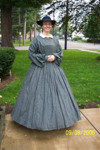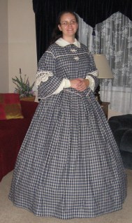 This one is a little fancier with undersleeves, lace on the elbows, a fancier collar, and accents on the bust. Again, it has the same elements as the day dress: bell shaped skirt, billowy sleeves, and off-the shoulder sleeves. This was the look that they wanted to give. Along with the corset, it was meant to draw the eye into the waist. The hoops, billowy sleeves, and low shoulder seams all played a part in making the waist look even smaller. You wanted the classic hour glass shape. There are no poofy shoulders, no empire waists, and very little skin exposed. The only time you would have more exposed skin was if you were attending a ball. Even then it wouldn’t necessarily mean that you had bare shoulders or arms. This look is very distinct to the Civil War era. Even the hair was done in a way to draw the eye down. You wanted to accent the fullness at the jaw line. You can’t see my hair very well, but take my word for it. The only time it was done up fancier was for special occasions (weddings, balls, etc). But then you would still have the fullness at the bottom. You didn’t want height.
