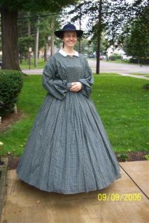 As you can see it’s very plain, but it has the traits that all period correct Civil War dresses should have: the bell-shaped skirt, the billow sleeves, the sleeves that start off of the shoulder, and the rounded collar with a simple broach. If you had stopped into any house on laundry day during the Civil War, this is how you more than likely would have seen the women dressed. Now let me show you a visiting dress that would have been worn when on the afternoon call, or even for church: