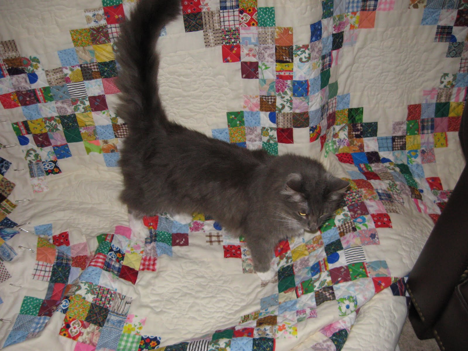 Then tonight I was talking with my mom while she was putting her latest quilt on the quilt frame. The cats wanted to help, and especially Bob: