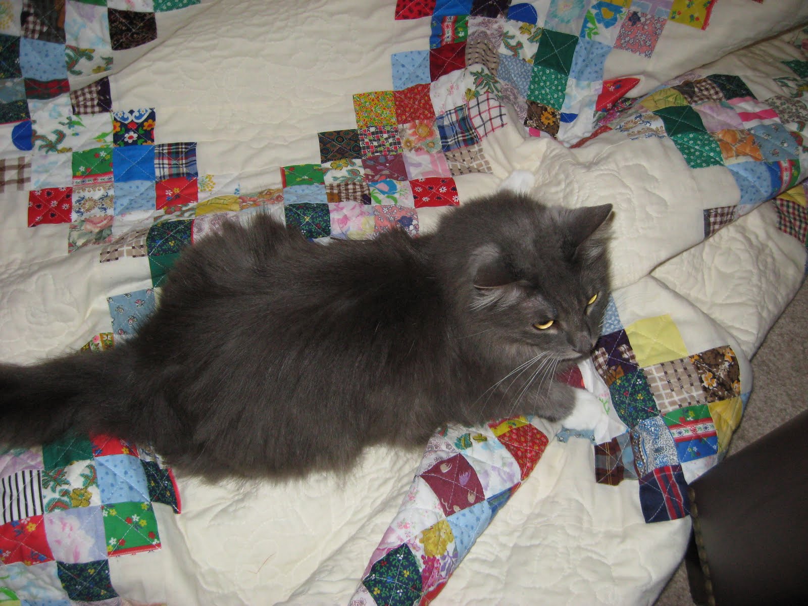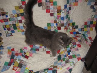 Lol – looks like your mom uses a quality control system similar to mine! Arthas thoroughly inspects all my quilts too. :0)