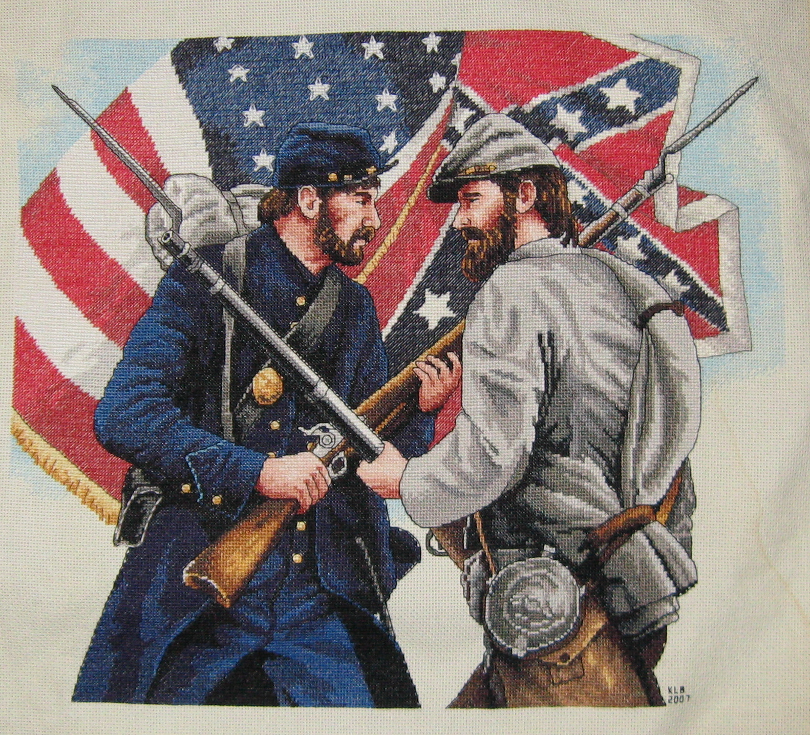 Tonight I drove to Erie so that I could listen to a presentation on the third day of the Battle of Gettysburg. This is my favorite battle of the entire Civil War. If you really know me, then you would think that’s odd since General Thomas “Stonewall” Jackson had been dead for well over a month by the time of this battle. Most people say that it’s their favorite because it’s the only one that they know. I can’t explain why it’s my favorite, all that I can say is that there’s something that pulls me to it. When I am in Gettysburg it’s like I’m home. And yes, the picture above is a piece that I actually stitched. I have yet to frame it, but this was definitely a piece that I did for myself.