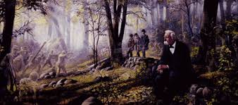 I don’t want to go on at length, but I have one more thing that I want to leave you with regarding this post. There are a series of paintings, and I’m not sure of the artist, but they show the veterans sitting at various places in Gettysburg. They are thinking about what happened there and what they saw. It’s rather haunting to look at these for very long, but they also give me goosebumps so I would like to share one with you. This one has Joshua Lawrence Chamberlain (the Colonel of the 20th Maine) sitting on Little Round Top and remembering his part in that ferocious day.