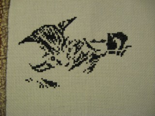 I haven’t posted my current square on here because until recently it just looked like some black blobs on my fabric. You can begin to see the cat, though, so I can now start taking progress pictures. He’s going to be stinkin’ adorable when I finish him. He reminds me a lot of Elmer: