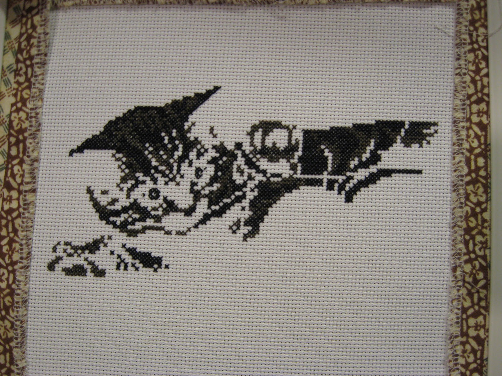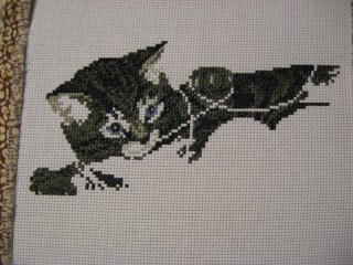 This week I didn’t have a lot of time to work on my kitten. I can’t remember what I was doing, but apparently I was busy. lol. I walked most of the week during lunch so I didn’t get a chance to work on it then, either. I did find a few hours this weekend to do some stitching while Jay worked on his Warthog.