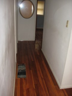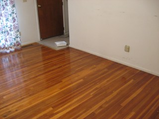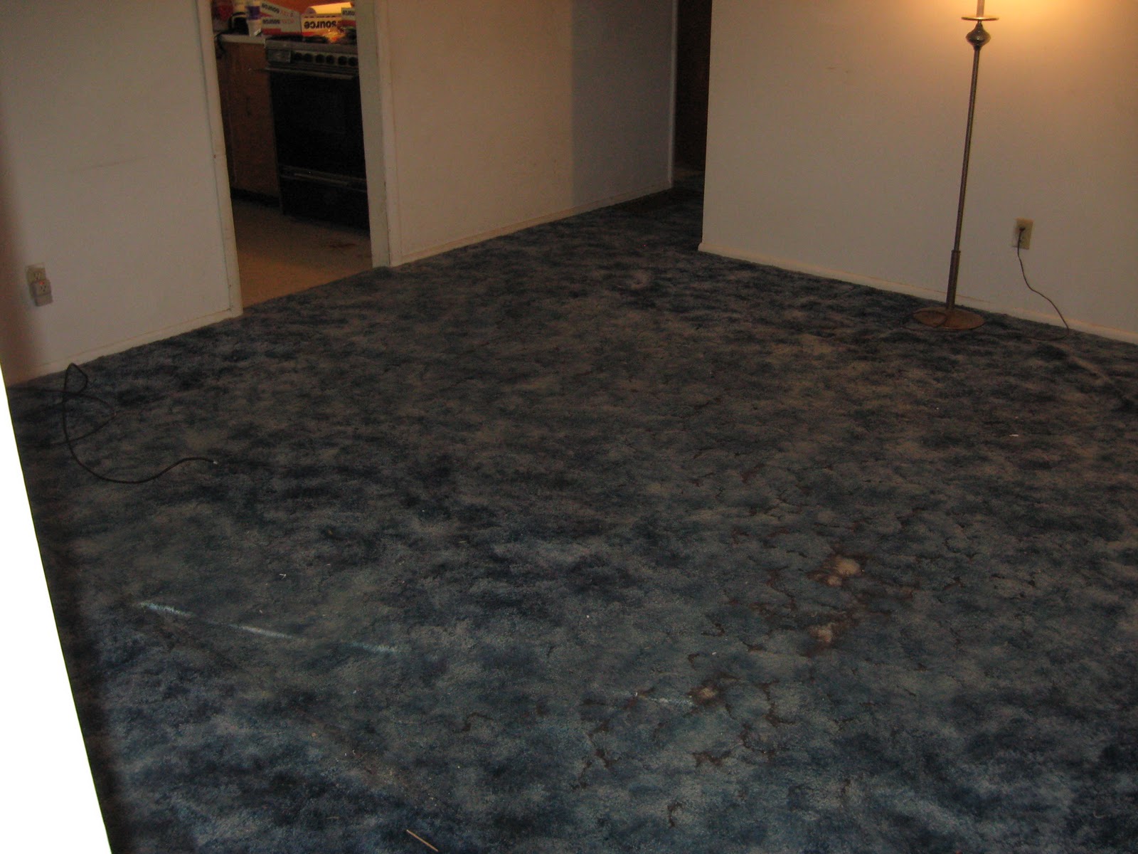 Here is the living room floor after the carpet was removed, but before we had sanded it: