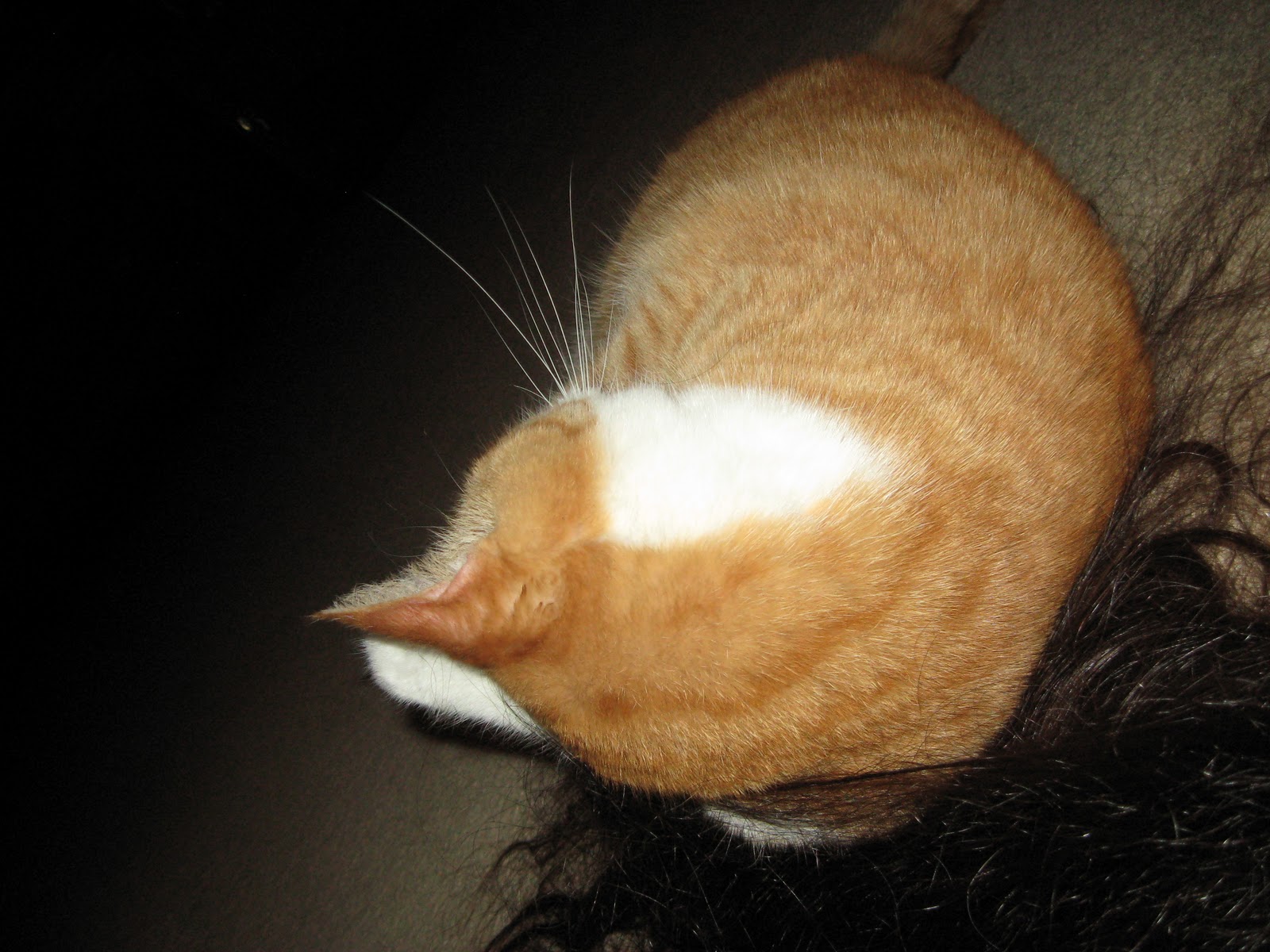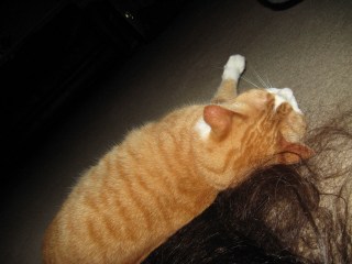 Talking about silly kitties, though, I had to share some pictures with you. For some reason my little girl cat, Chester, LOVES to roll around on my hair if I’m laying on the floor. I have no idea why she does this, but it cracks me up. I only allow her to do it when I know that I will have to take a shower soon. That way I can wash out the cat hair, too. But she loves to do it so I indulge her now and again.