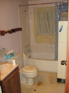 Lately I feel like I’ve been treading water when it comes to my house. I have done a lot there, but I can’t really tell (except for the floors). After I saw how beautiful my hardwood floors turned out, it made me realize just how much I hated my bathroom floor. Okay, so I hated the bathroom altogether. This is what it looked like: