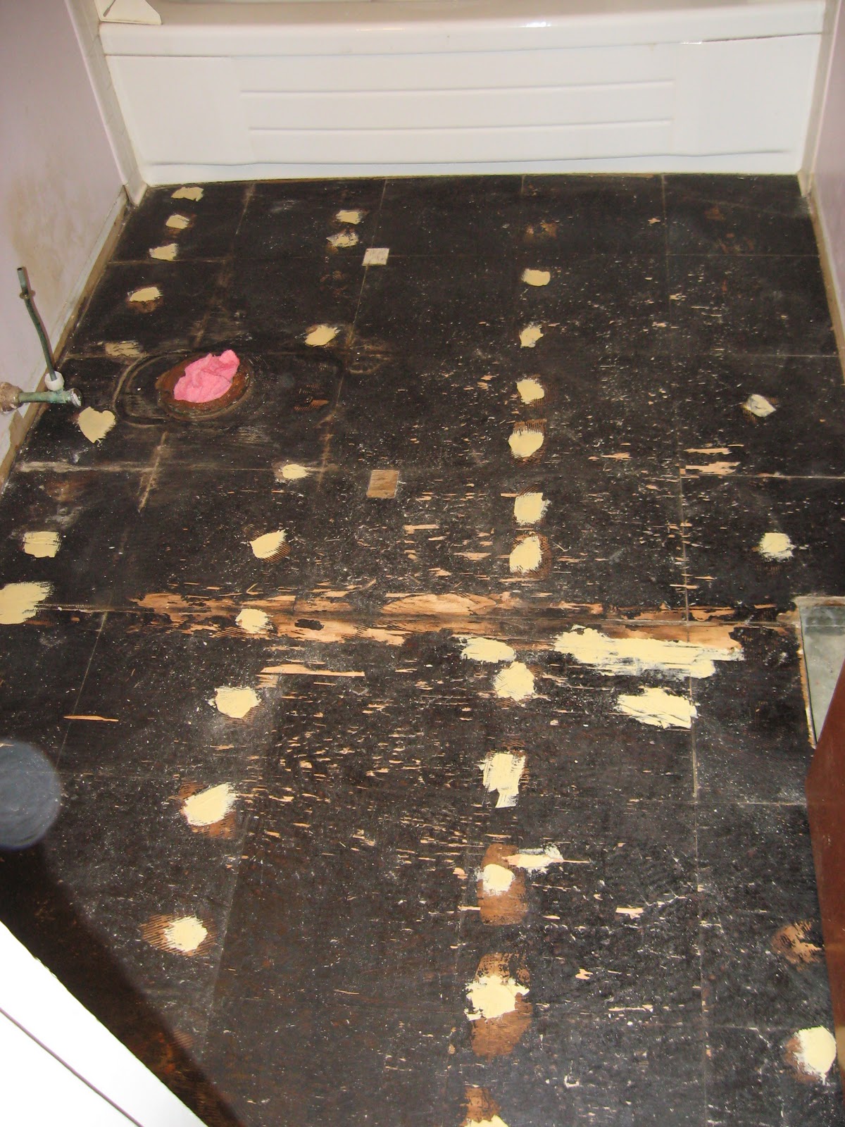 The black is the adhesive for the old tiles, and the spots are where I filled in the nail holes with wood filler. The tiles came up easily enough, though the first one was upset that I was disturbing it so it decided to get some revenge. A piece of it tore into my thumb and now that’s a bit sore. Oh well, it’s not a true do-it-yourself project unless you have a scar to show for it, right? 😉