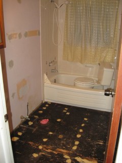 We turned the water off, removed the sink, and put the toilet into the tub for safe keeping. Then I spent Monday night tearing out the old tiles.