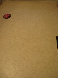I used up the last of my vacation time at work to take Tuesday afternoon off so that my dad and I could install the linoleum that I bought on Saturday. When I had been in Erie with Jay we had stopped at a couple of carpeting places. I was looking for linoleum that didn’t have any kind of pattern to it. This way my dad and I wouldn’t have to work harder to make sure that the pattern lined up correctly. I knew that if it didn’t then it would drive me crazy to look at for the rest of the time that I lived in the house. Little things get to me like that. lol. The only vinyl that the first place had was the ugliest thing! I looked at it and asked Jay, “Is it just me, or does that look like a skinned pig?” It was a mottled pinkish-whitish piece with a bit of red and brown veining. It wasn’t pretty. He looked at it and replied, “I’m not sure what a skinned pig looks like, but I imagine that it would look something close to that.” Luckily at the second place I found exactly what I had been looking for.