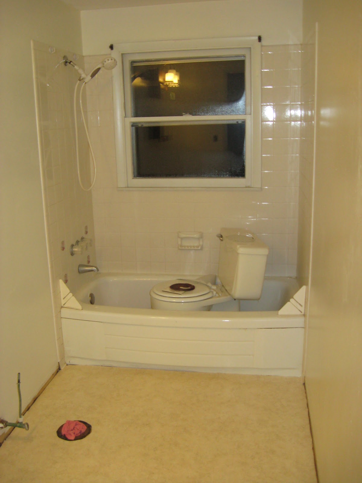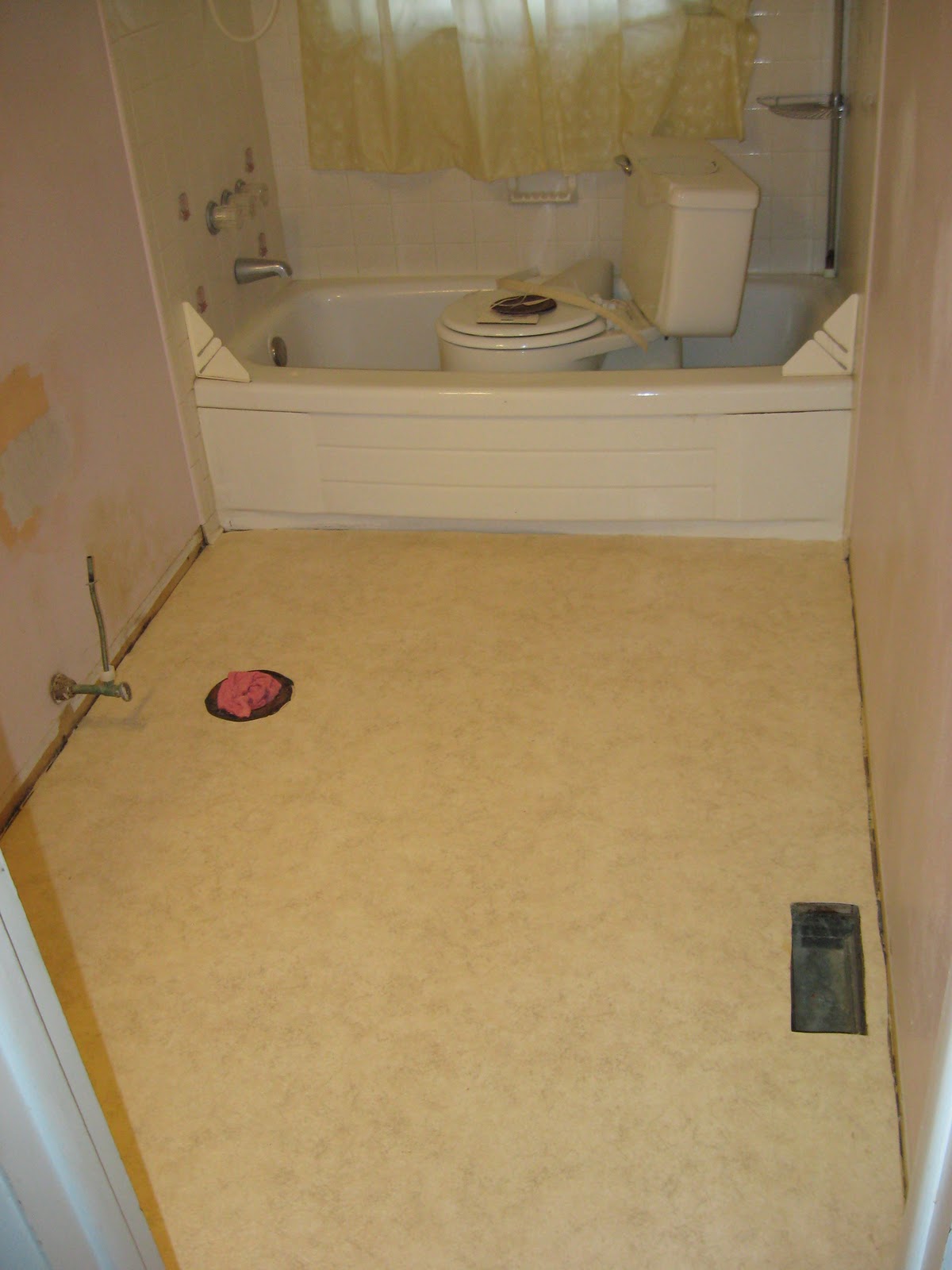 The floor was gross. The walls were pink. The bathroom sink and vanity were tiny. The shower curtain over the window…. I hated all of it. I decided that I didn’t want to live with it like it was and since I had some time I would just redo it before moving in. I am going to keep the toilet and tub as is, I just wanted to replace the floor, paint the walls, and get a new vanity and sink. I asked my dad to help me with parts of the remodel.