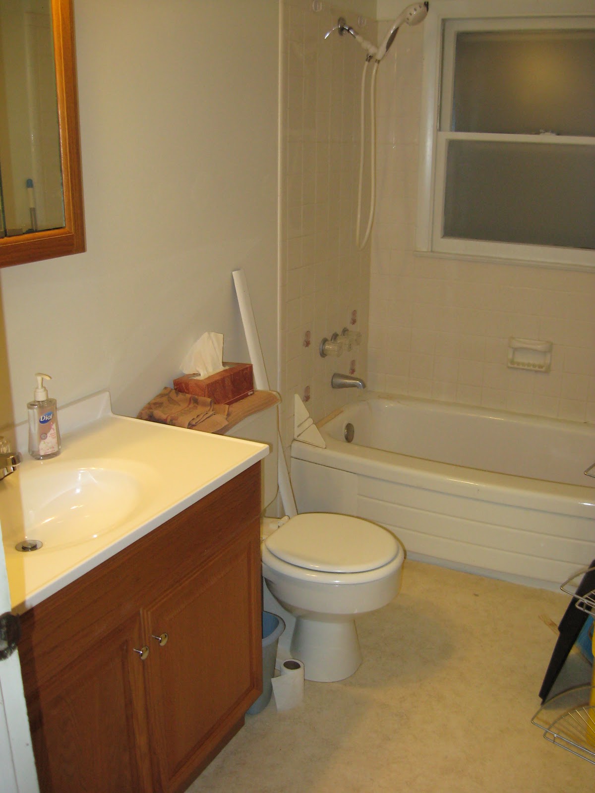 I bought a vanity and sink this past weekend so my dad stopped by on Monday to help me install it. It’s so nice having a big sink in there! Just to show the difference, here was the bathroom when I first got the house: