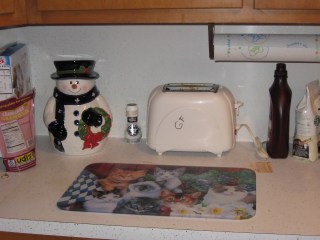Isn’t the snowman cute? That was a house warming gift from Jay’s mom. It’s one of the few festive pieces that I have displayed in my house right now. I’m too busy trying to get things unpacked to worry about Christmas decorations. Yes, the ‘GF’ on my toaster stands for gluten free. When I was at my parents’ that’s how I had to let people know not to use my toaster.