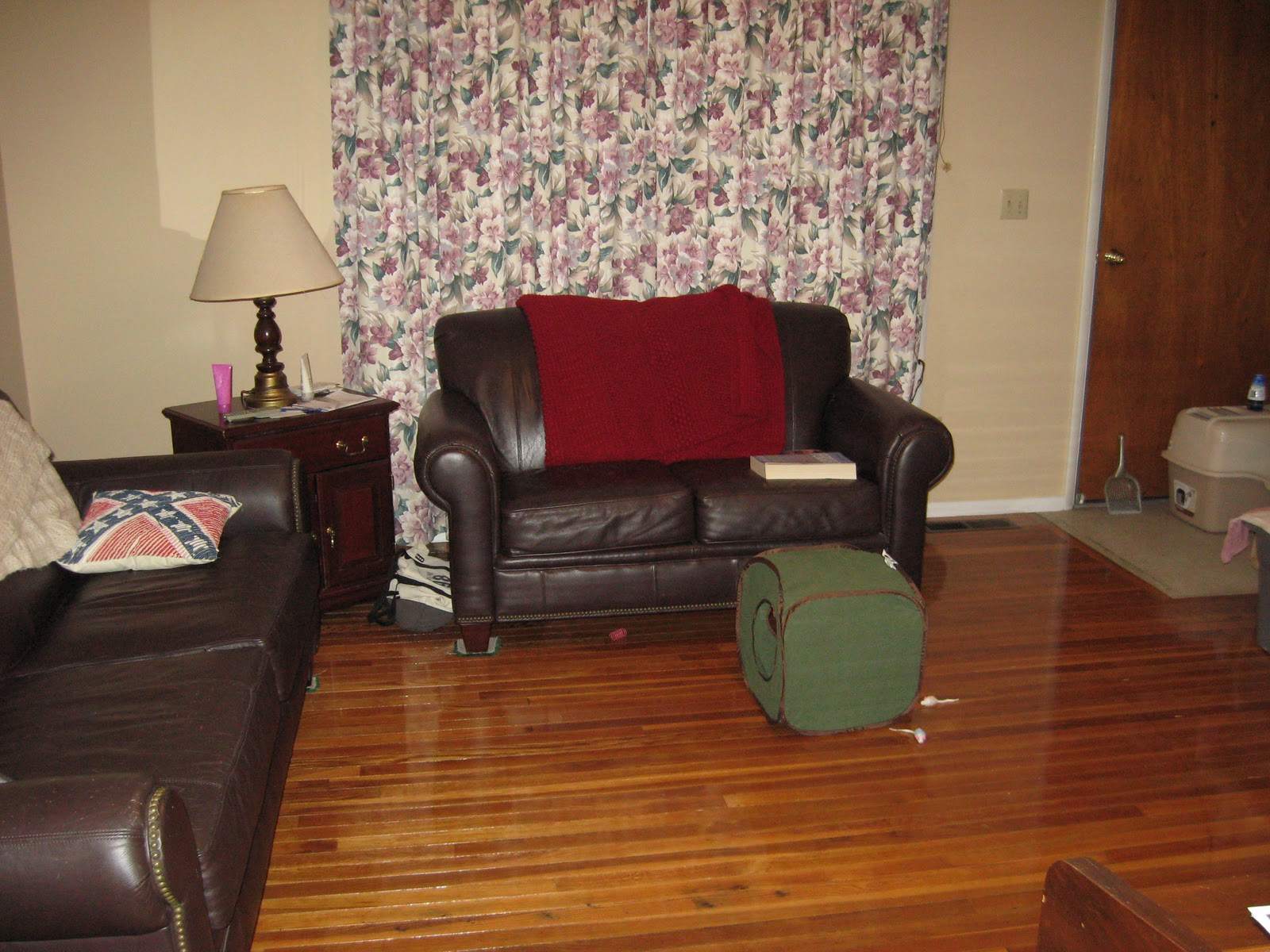 The drapes are still in really good shape so I just washed them to remove the dust and animal fur. The litter box will eventually go in the basement once Chester is no longer afraid to go down there. *sigh*