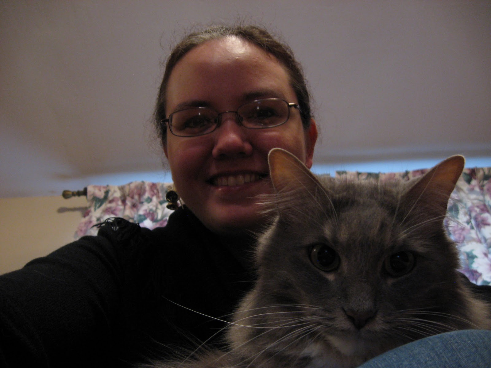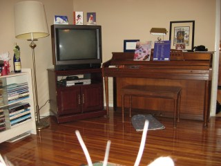 If you’re wondering, the white ‘sticks’ in the picture are actually Bob’s eyebrow whiskers. It took me a minute to realize what they were. I was sitting on the loveseat and Bob feels that if I’m sitting then he needs to be on my lap. You’ll see pictures of that later. When my dad moved the piano in he told me that if I moved again he was NOT moving the piano. *Sigh* I guess that I should take up playing the flute or something. π