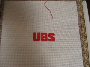 I am currently working on the white. Once I am done with that (it goes on the inside of the square between the red that spells out ‘CUBS’ and the blue circle that will eventually go around it. Now that I’m in the middle of the project I really enjoy it. I hate starting new pieces! lol