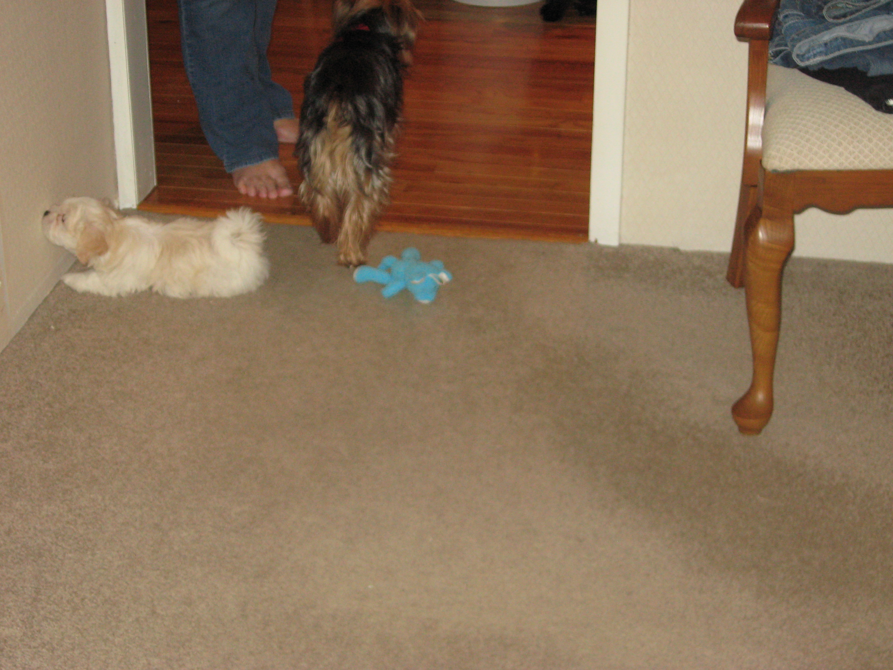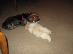 A few weeks ago while I was visiting at my parents’ house, my mom came home with a new puppy. My dad wasn’t too impressed because Buford, my mom’s Yorkie, was not known for getting along with other dogs. In fact, the last two dogs that my mom rescued we had to find homes for them because Buford tried to rip them apart. This most recent puppy was another rescue. I don’t recall the entire story, all I know is that the puppy was being abused by some lady’s kids so my mom said that she would take him. We aren’t sure what breed he is, but to me he looks like a cross between a Maltese and a Cocker Spaniel. He’s a character, though, that’s for sure!