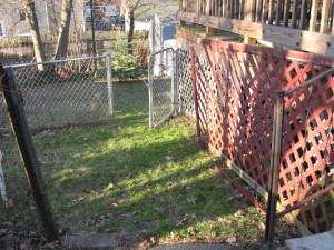 Here we have another picture of the double fences. Also, you can’t see it, but to the left is a pile of crap that my uncle left. Literally. He tossed all of the dog crap into one spot. Nice, eh?