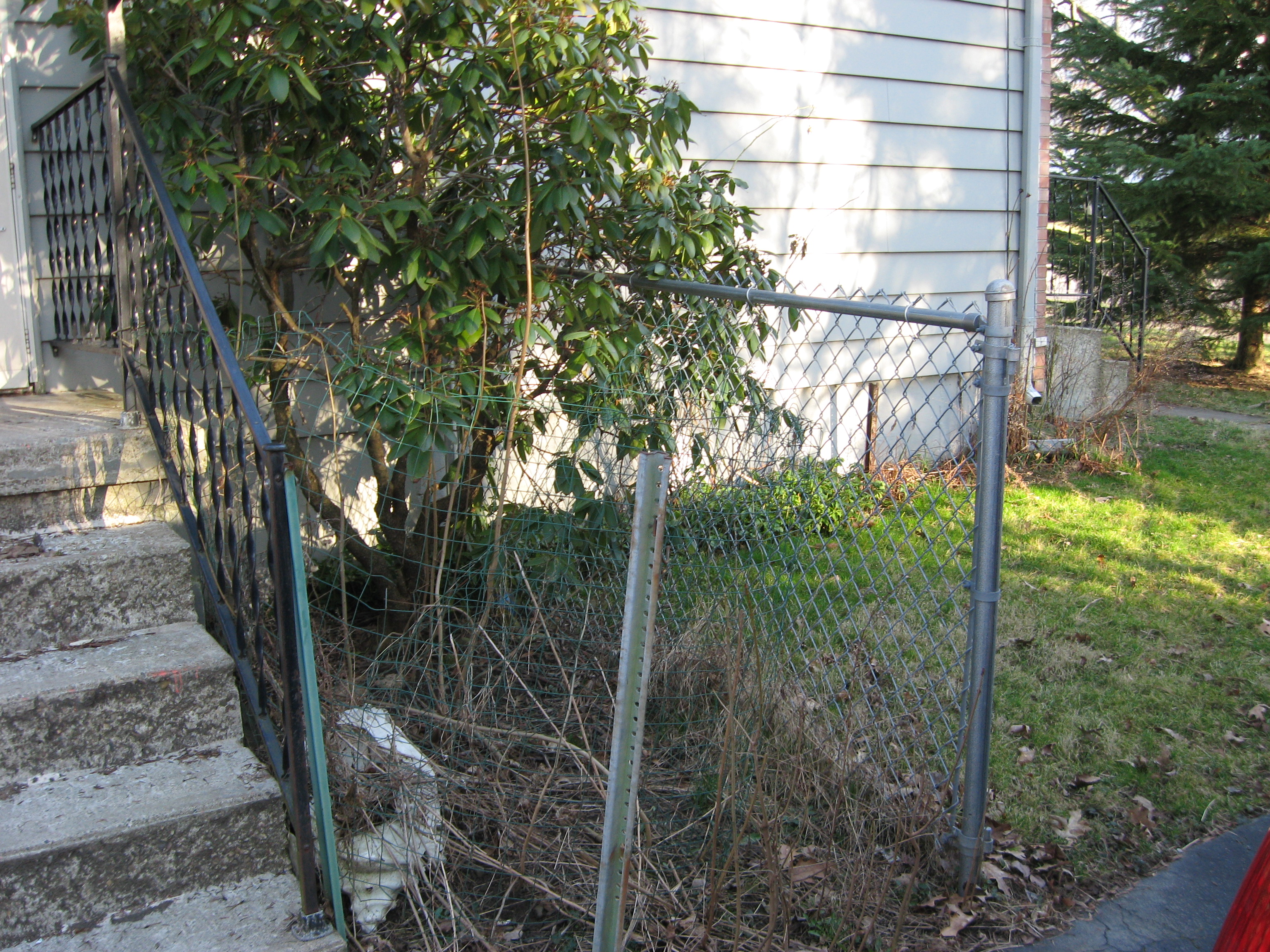 These are the other two sections of fence. The only part that I’m going to keep in place is the far chain-linked fence. In fact this fence with the red gate rather irritated me. When I would shovel I had to toss the snow over that fence. One night I was in a rotten mood, so I kicked the snot out of it and opened it up. lol. Not very mature, but it made me feel better.