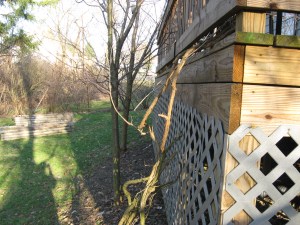 … the trees. My grandma loved nature and birds, so my aunt and uncle bought her these trees. She wanted to be able to see them when she looked out her kitchen window so my uncle planted them close. Can you see how close they are to the deck?? They are still young with lots of growing to do so it’s not like they are going to stay that size forever. Not only that, but these are flowering trees. Not a good thing for a person with allergies to almost everything that’s natural. Needless to say, these trees are coming down. Also, this twisted branch thing in the front of the picture is some kind of bush that grows flowers that hummingbirds love. That’s all fine and dandy, but when this bush is at it’s prime it’s huge and covers the entire corner of the deck. That will be removed as well. I don’t need my allergies flaring up, and also it’s not good for the deck to be covered by a moist plant like that.