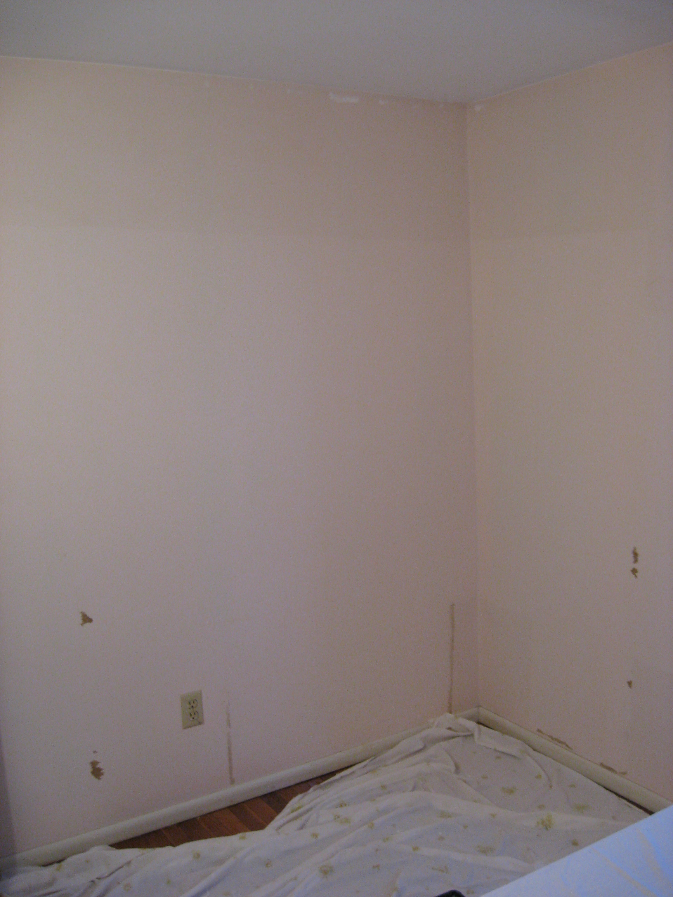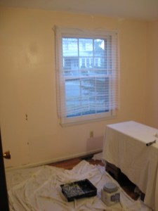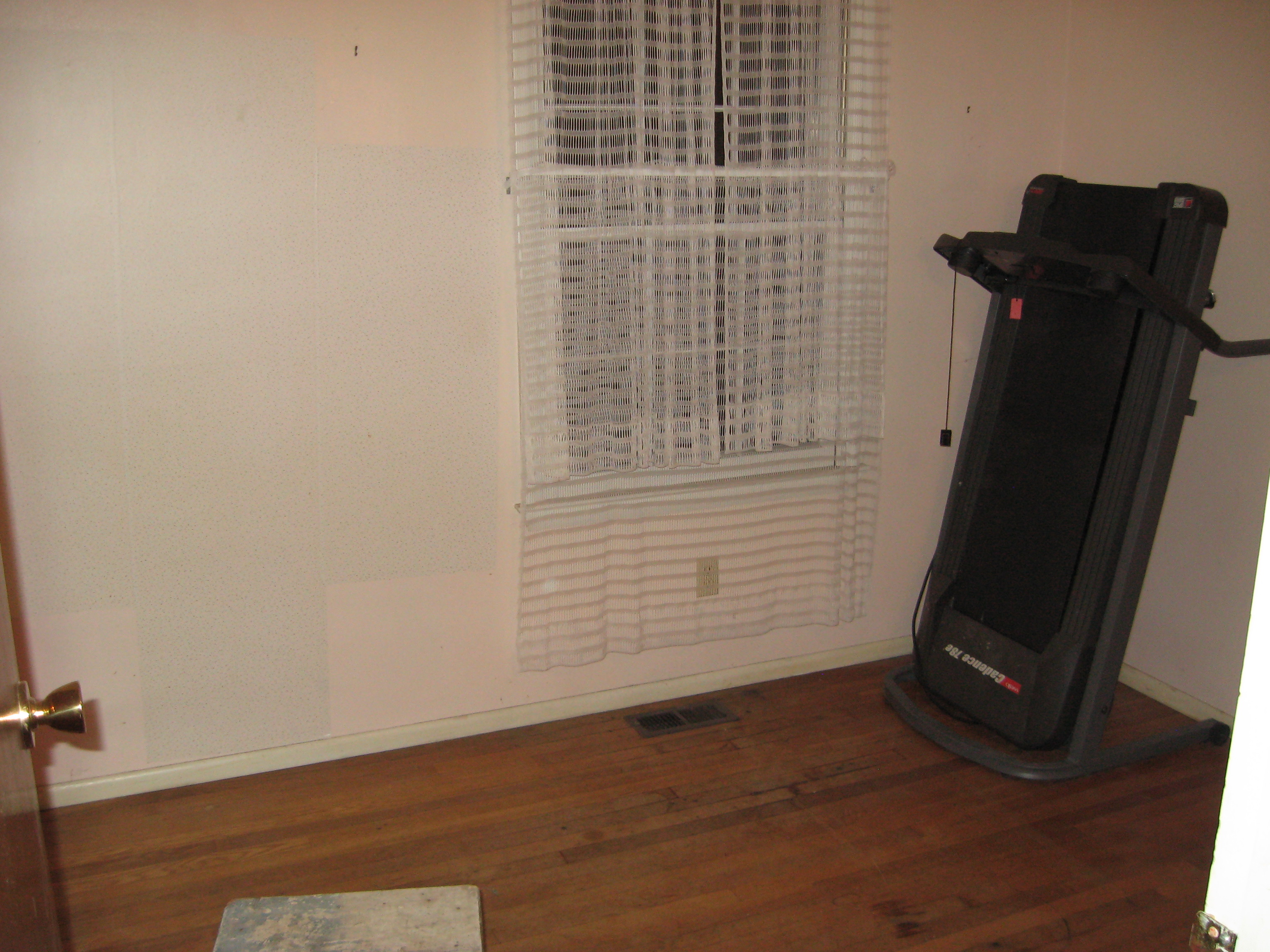 This is what the front bedroom looked like when I bought the house. I loved my grandma, but I’m not sure what she was thinking when she put the contact paper on the wall. You can see it to the left of the window. It peeled off easily enough, but it left behind a sticky residue. I did my best to get it off, but it still remained tacky. I gave up and just decided to paint over it. A mistake? As of right now… nope. lol