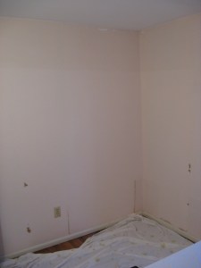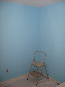 As I was standing there looking at the walls I just knew that I couldn’t bring myself to make them a neutral color. I need personality in there. So that left me in a quandry. The only other colors I have are blue, green, white, and a creamy ivory. Blue is my favorite color and I knew that I had about a third of a gallon left from when I painted my bedroom. That color had been a bit bright, though, so I thought I would tone it down with some white. At first I was worried that I was making it too light, that it would look more like a weird white than a blue.