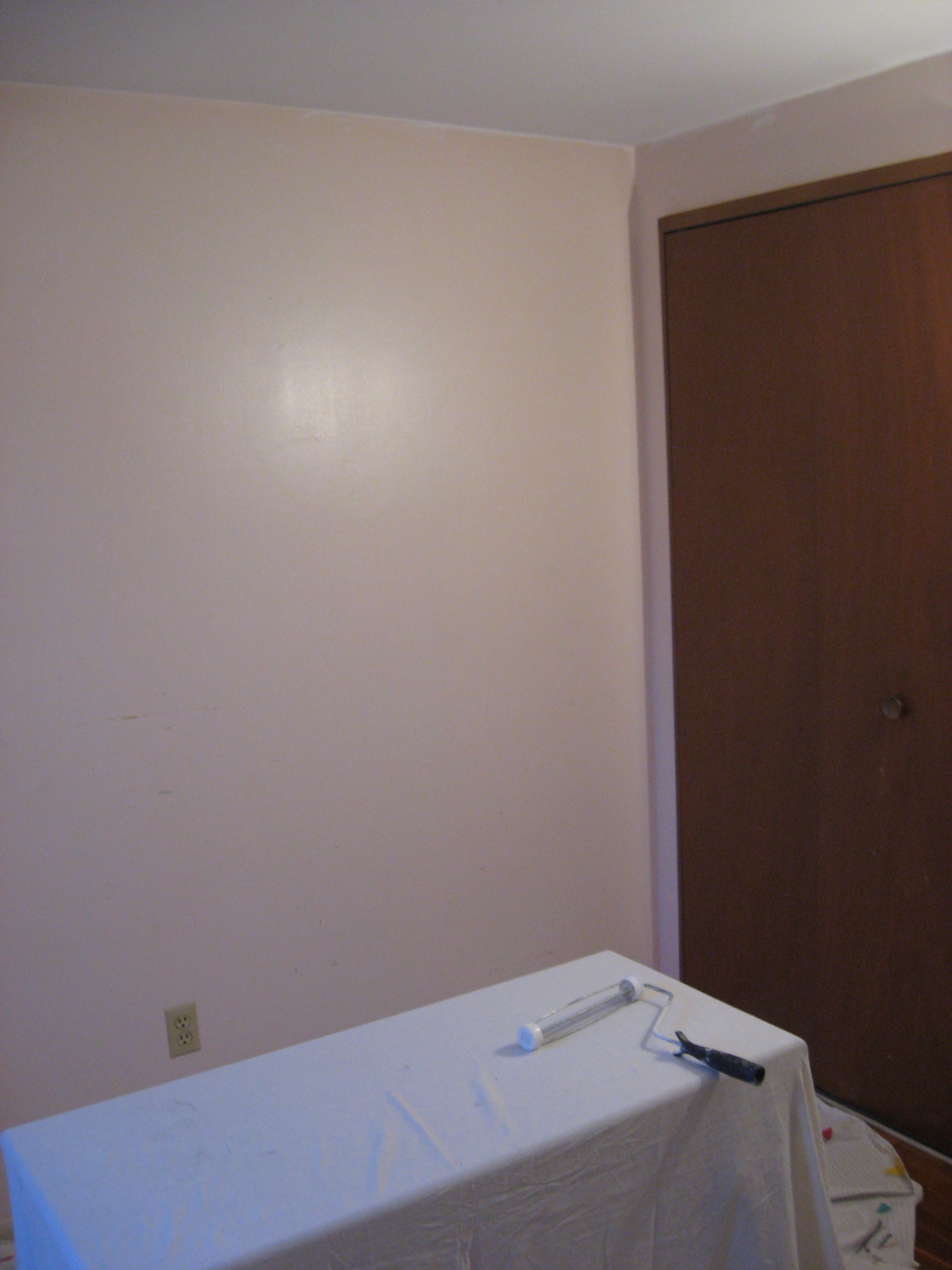 This is right before I got ready to paint last night. I don’t have any shelves or books up, but my goal this week was to get the walls painted. The ceiling has been painted in this picture, but you can’t tell. Also, you can’t see the gorgeous floor. It’s definitely under there. Believe me. I had originally planned on painting the walls the same color as my living room, which is a tannish color. Here, let me show you.