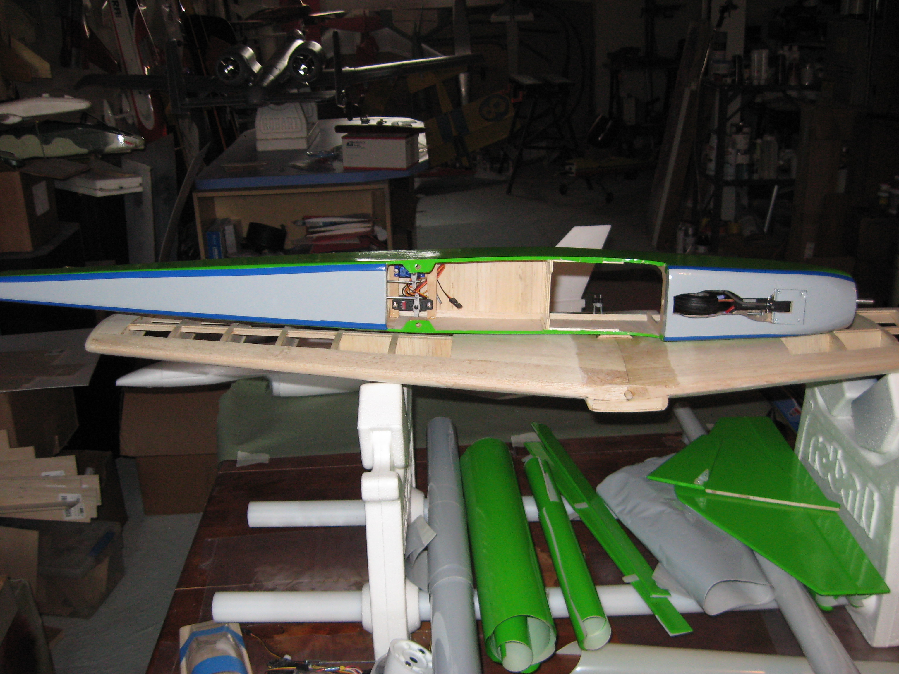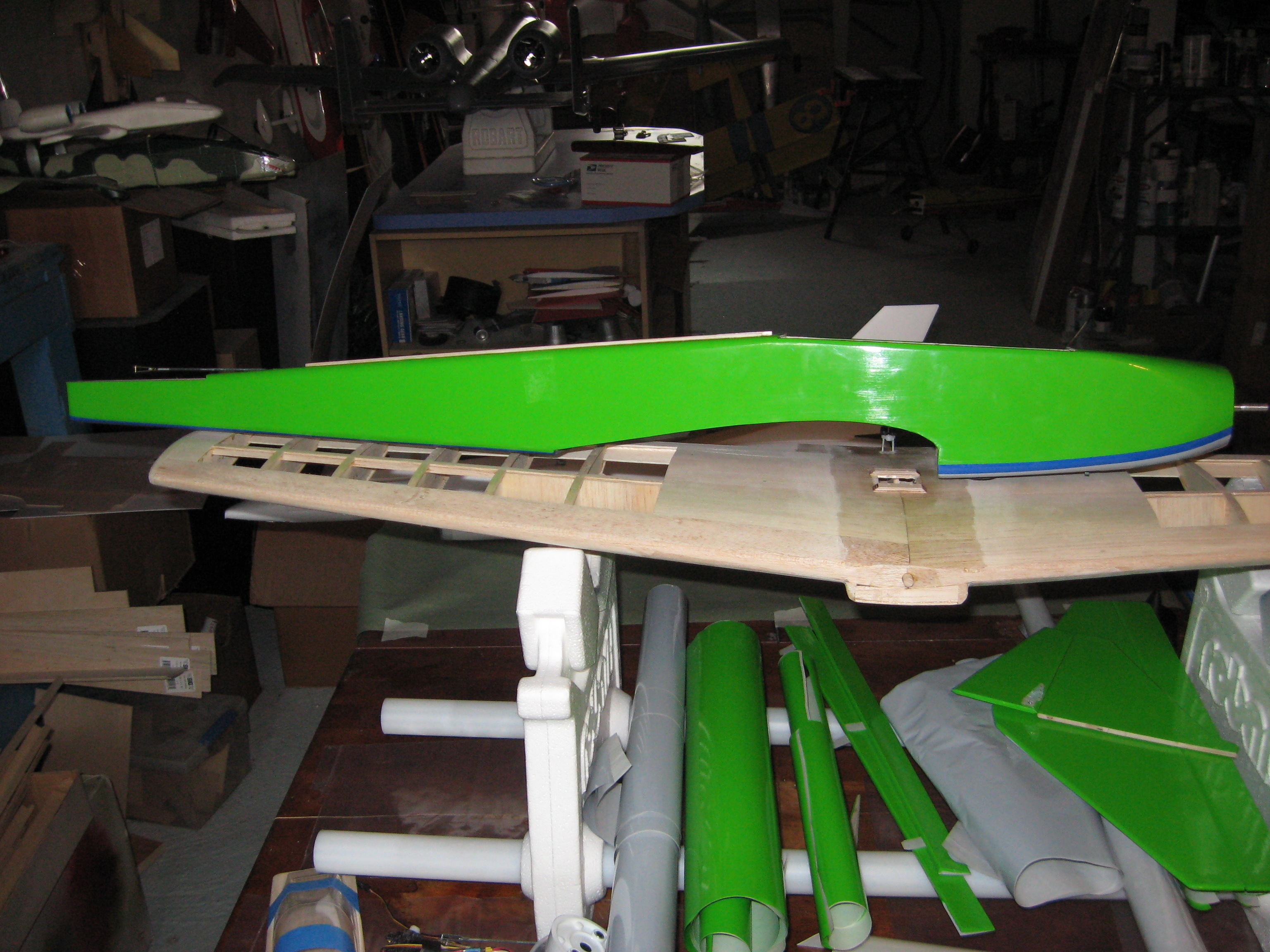 Here is the bottom of the fuselage as of Sunday. You can see that he has begun to stripe it with the blue. Oh, and if you look under the wings you will see the tail has been covered in the bright green that was chosen for it. I’ve changed my mind on the name of the plane. It’s not easy being green, so I think that this needs to be Kermit the Kobra. 🙂