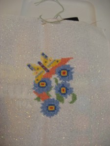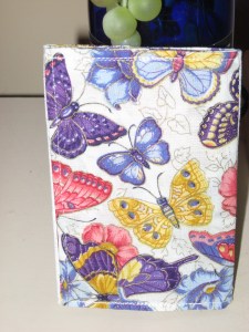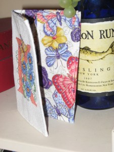 This is how it opens, and then it has enclosed ends so that you put the passport in it like the fabric is a book jacket. When I found the cross stitch pattern I knew that my mom had this butterfly material and that it would look great together.