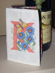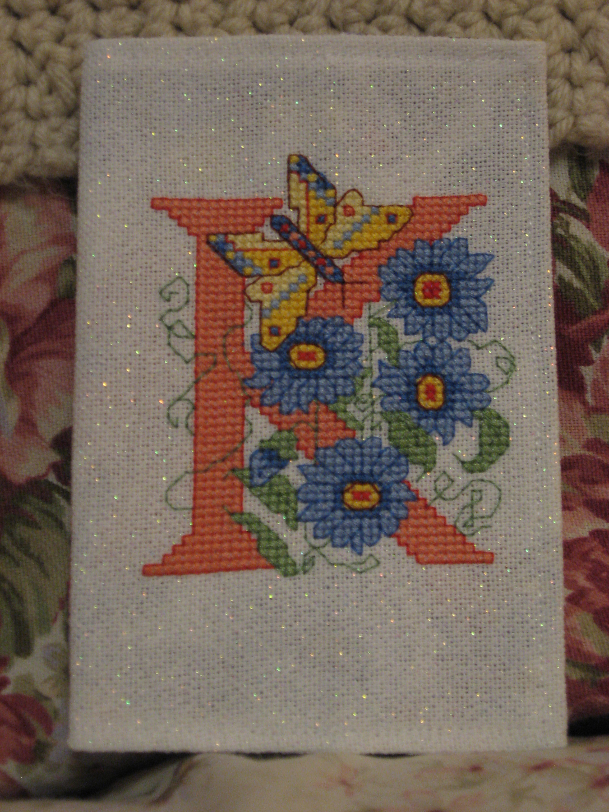 About a month ago Jay’s mom asked if I could make a passport cover for her. I had no idea what kind of passport cover she wanted or even where to start. I did a search online and found some instructions for a book jacket-like passport cover. Then I looked through my cross stitch patterns to see what I could find that would work. I found an alphabet booklet that had a really pretty ‘K’ that was about the right size. So, using some opalescent evenweave that I had on hand I got to work.