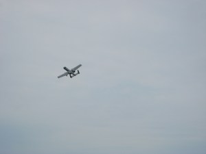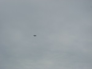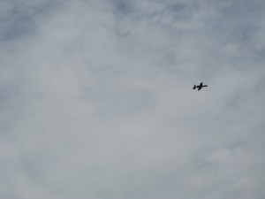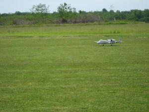 It takes up almost the entire back of the car, and that’s with the wings and tail off. Saturday morning was overcast and gloomy looking, so Jay was hoping that there wouldn’t be many people at the field. Just in case. There were a couple of guys there, but we hauled it out of the car, assembled it, and started the batteries to charging. Jay flew one of his other planes and we both tried to act like we weren’t nervous about the upcoming flight.