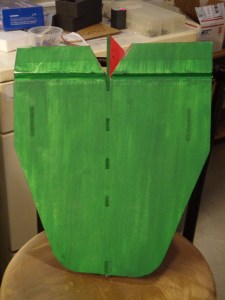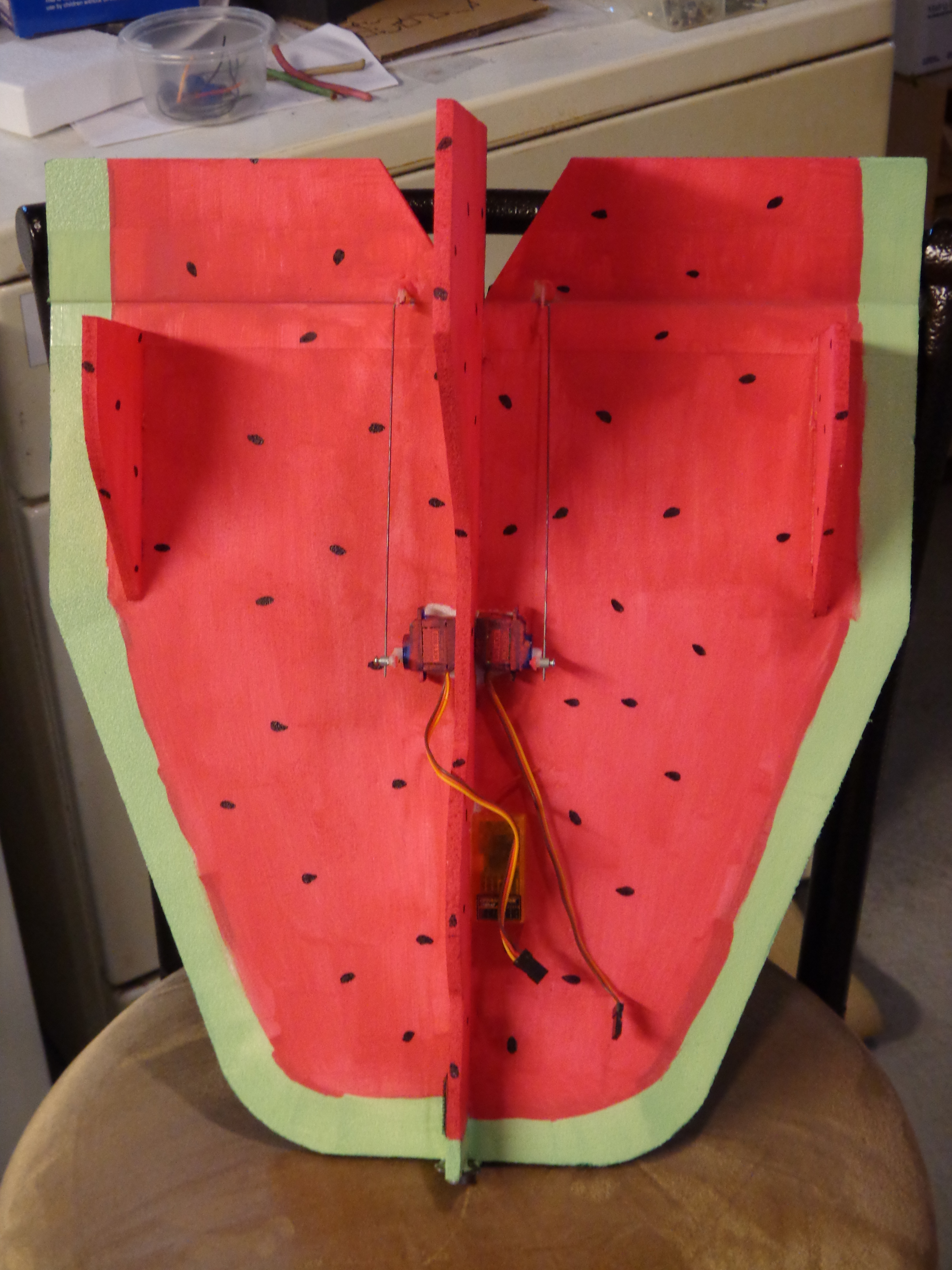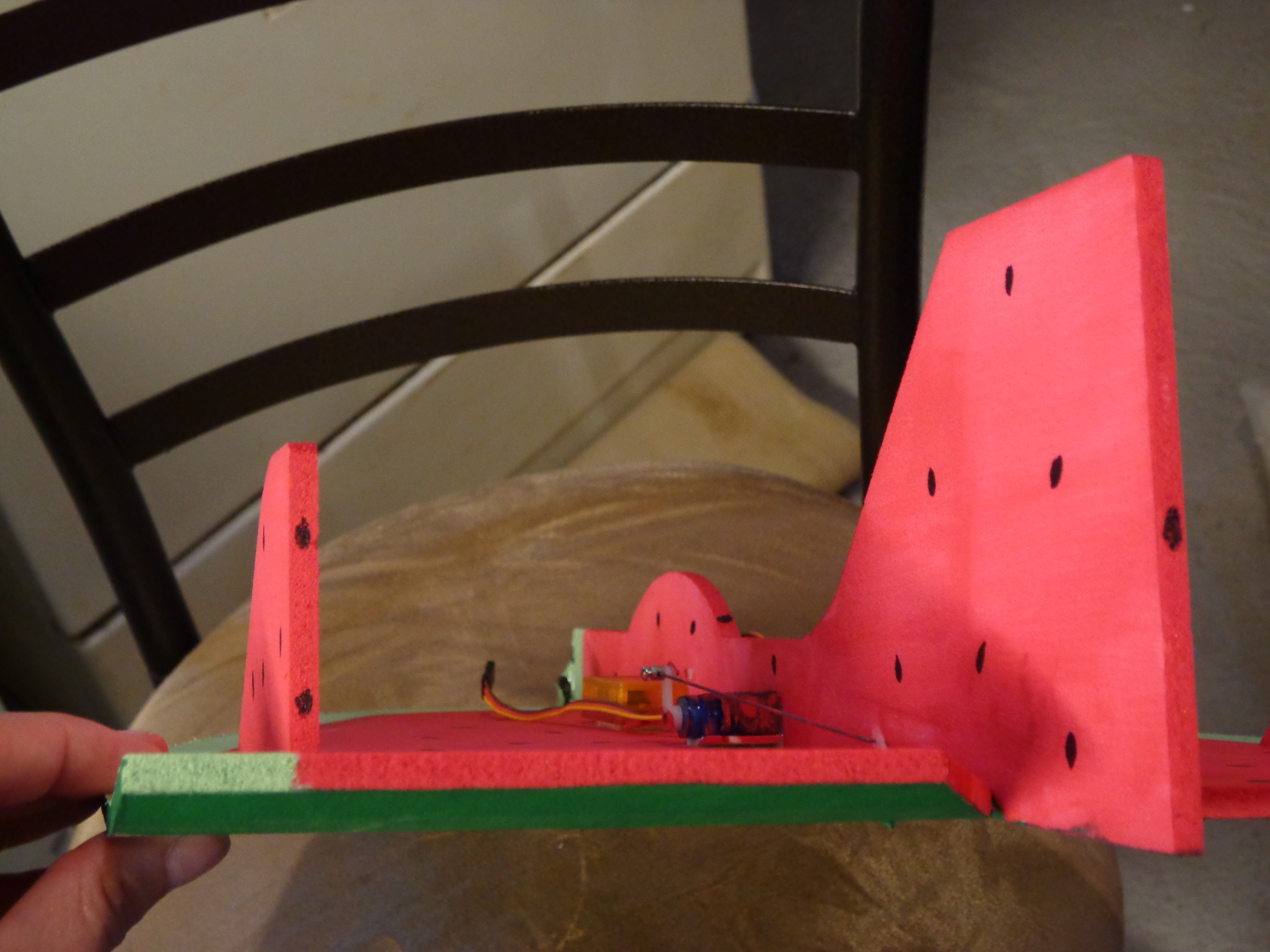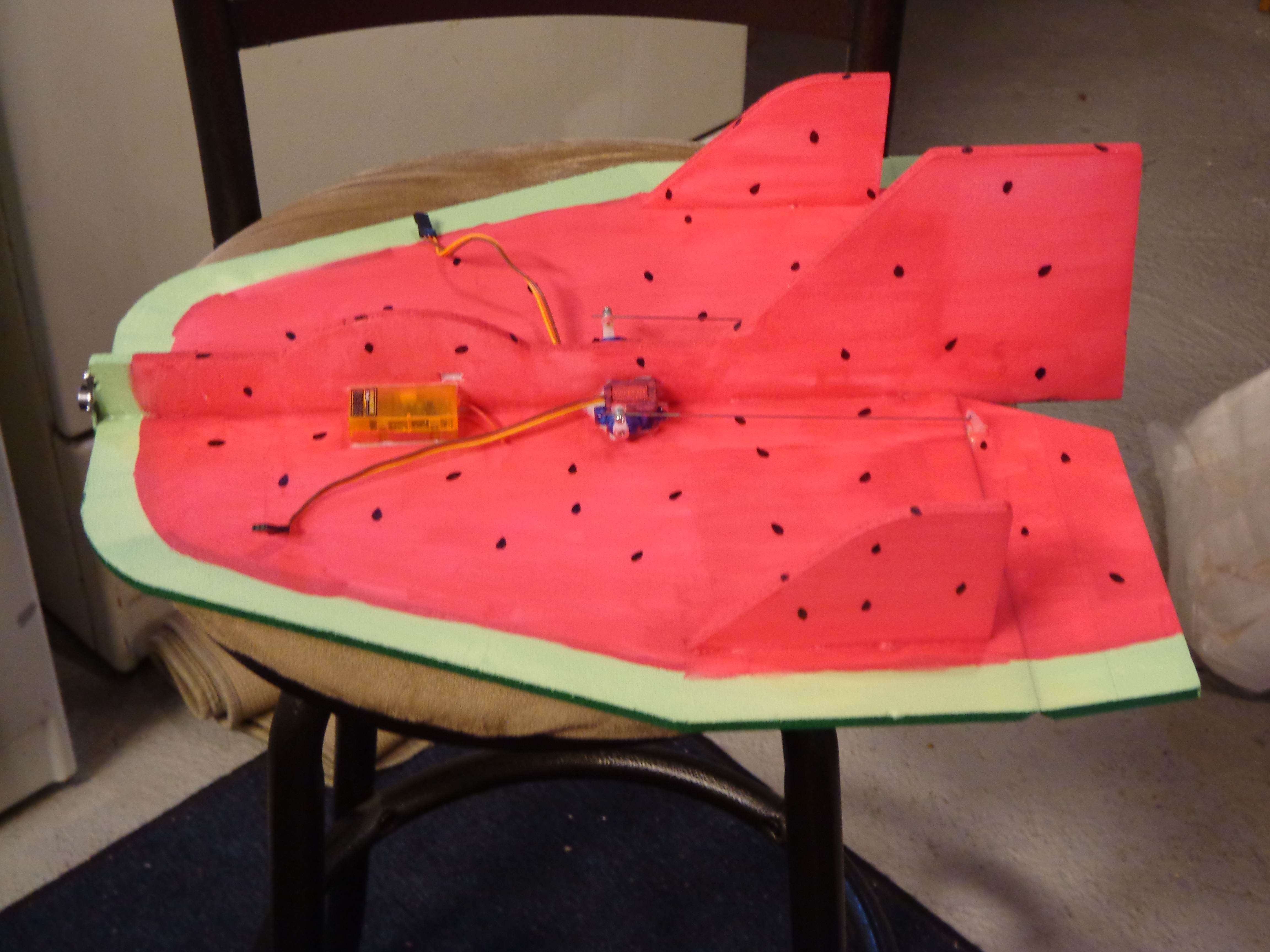 This is the underside, the ‘rind’. Part of what convinced me about the watermelon paint scheme is that you have to have enough of a contrast between the top and bottom of the plane that you will be able to tell which side is which when it’s high in the air. After all, you don’t want to think that it’s right side up, so you pull back on the elevator stick to go up, but instead you end up diving straight into the ground because you were actually inverted. The pink and green contrast perfectly. Jay test flew it and he said that it looks great.