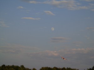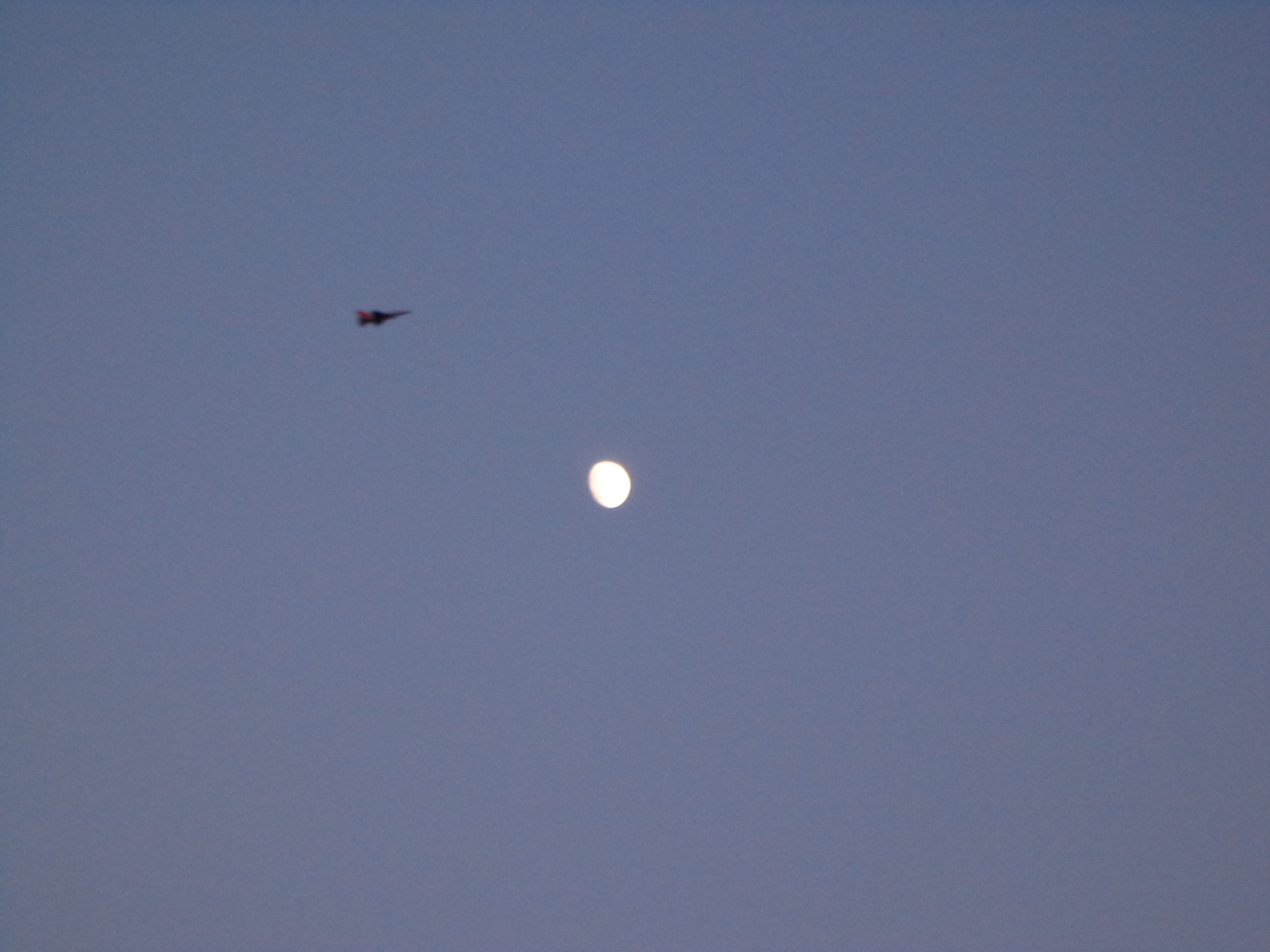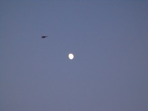 When we had a beautiful moon out I asked Jay to attempt to fly slowly by so that I could take a picture. This was the best shot that I could get. It still looks pretty neat, so that’s okay. I think that if I could change one thing about the camera that I am using, I would want a longer zoom. There are some times that I would like a closer shot. Oh well. It’s still pretty neat.