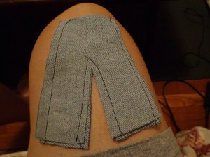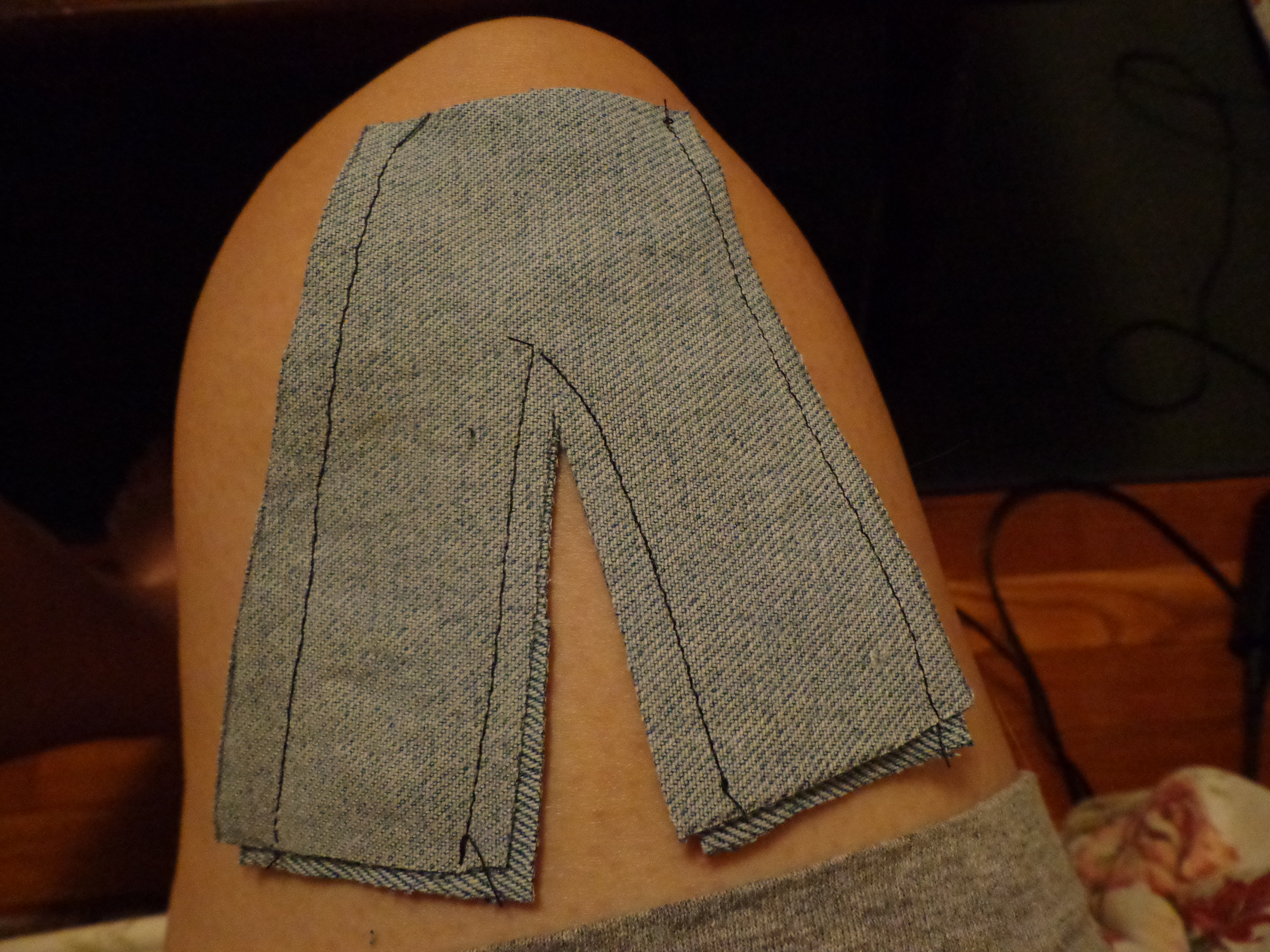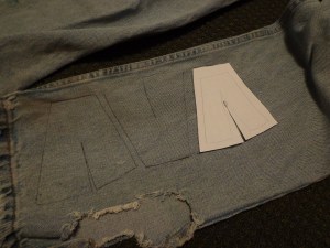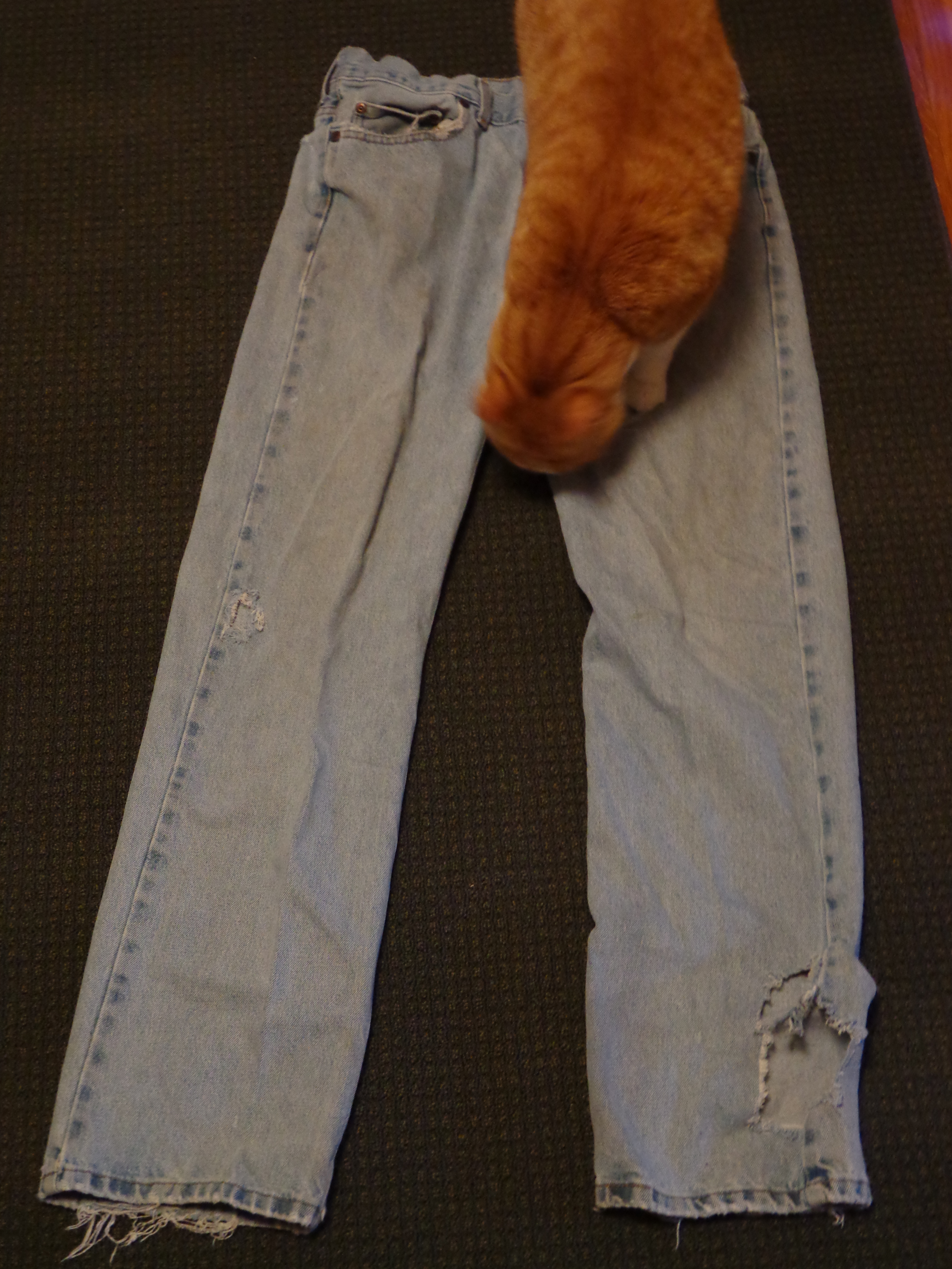 Jay had a nasty pair of his work pants that I decided I was going to throw out (he had already purchased a few more pairs to replace them). Since I already had this material I wanted to use it instead of just tossing the whole thing out. Denim is a forgiving and tough material that will hold up to a lot of abuse. I figured it could hold up to my gentle flying style on the LT. As you can see, I had help.
