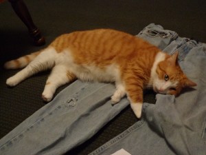 Make sure that you lay the fabric out flat. You don’t want to get any wrinkles in it or spots where the fabric is less than perfect. You might want to get somebody to help you closely inspect the fabric, just to make sure that it’s good enough to be used as wheel pants. Luckily this one passed the strenuous quality control testing that Chester put it through. She gave me the paws up to say that it was good.