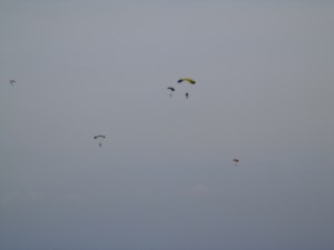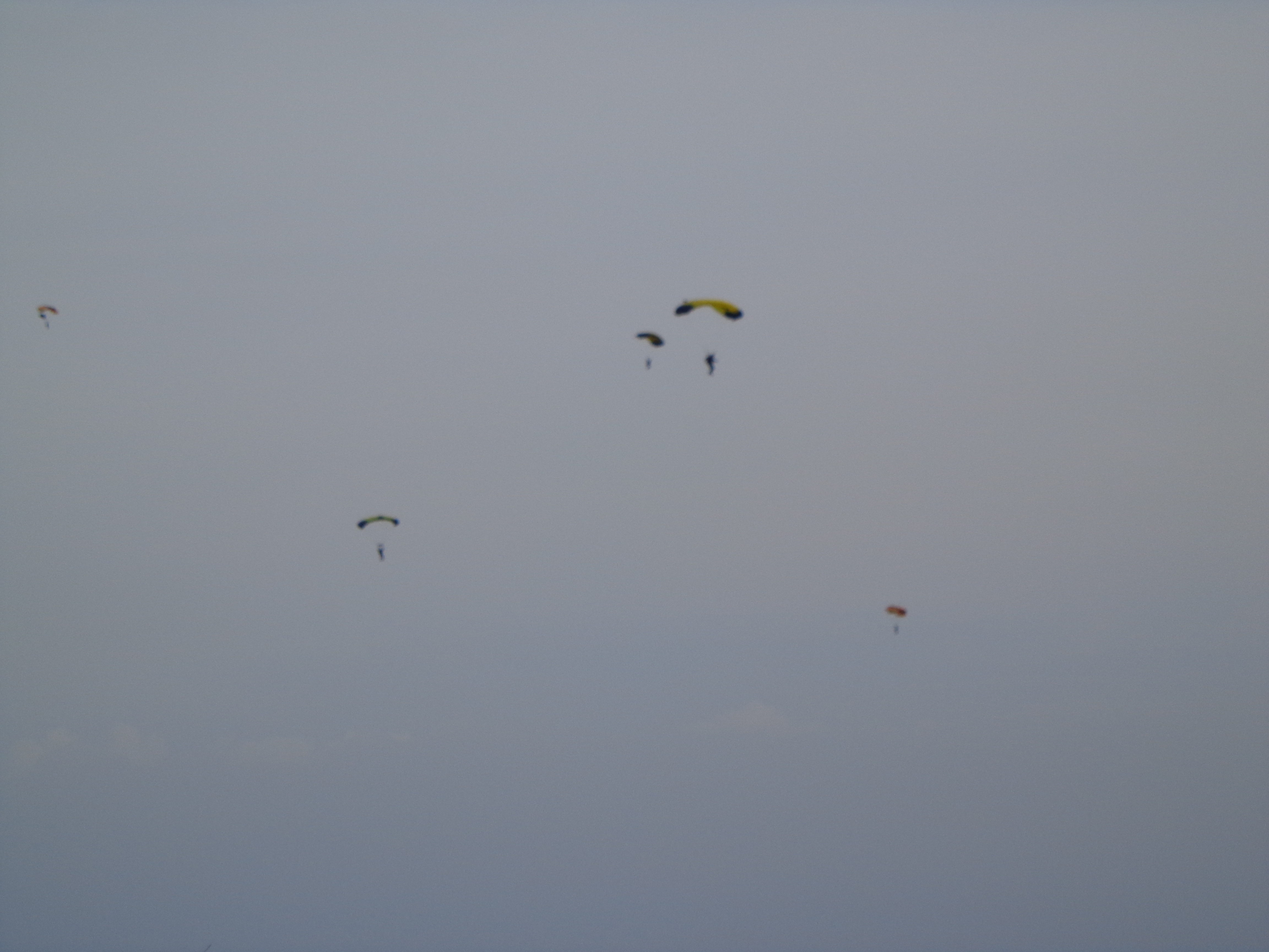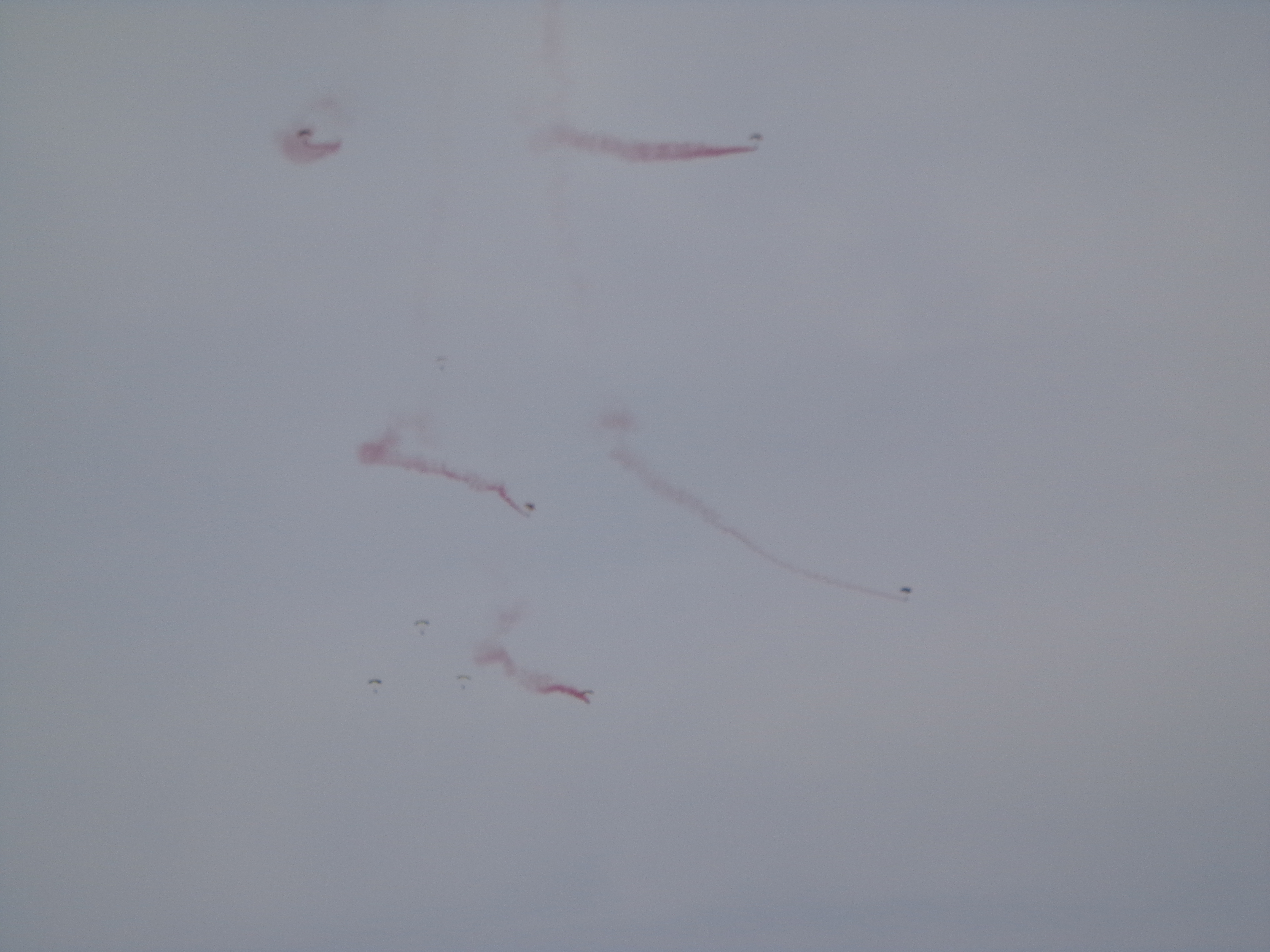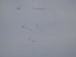 The Army Golden Knights always do some fancy parachuting stuff, and this is what it looks like when they are way up, before deploying the chutes, and all you see are the streams of smoke that they set off. The Navy also had their Leap Frogs there.