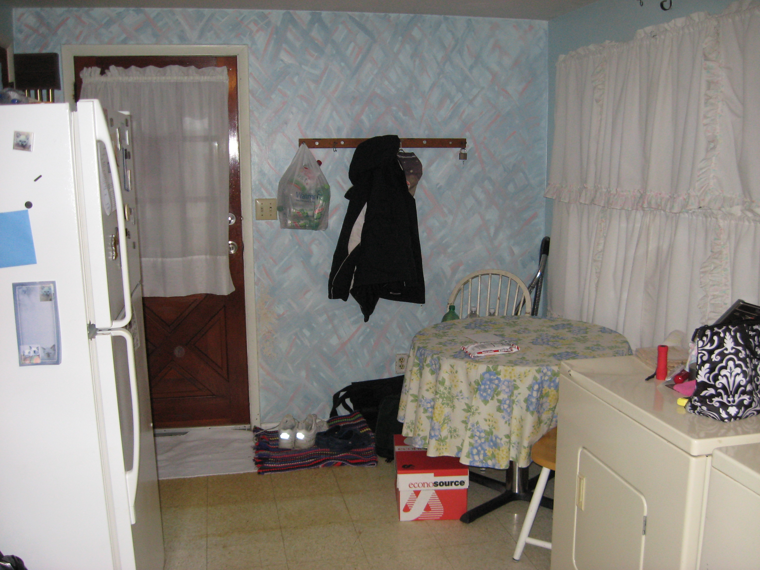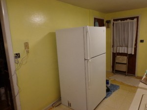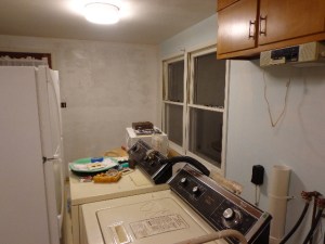 I washed down the walls and cleaned up behind/beneath the washer, dryer and fridge. I don’t know how many years it had been since that was last done, but the water was NASTY! I had a nice yellow that I wanted to put on the walls, so I had to prime them first in the hopes that it would help to cover up the blue that the walls were currently painted.