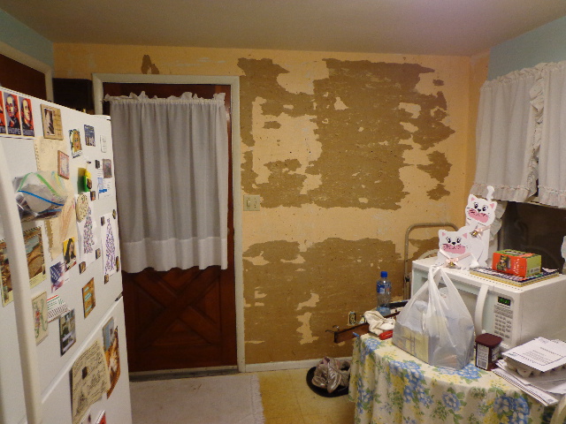 As I pulled on what I thought was the drywall paper, so that I could correctly patch the holes, I realized that it was NOT drywall paper. It was wallpaper! And I had managed to rip an entire strip off of the wall. Great! Now I had no choice… I would be painting the kitchen. I’ll admit that I only pulled the wallpaper off of one wall. There were three layers of this stuff, the top one being a rather stiff vinyl type.