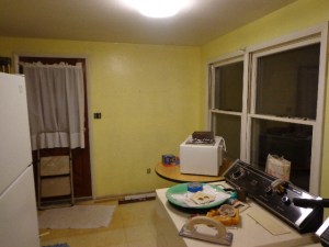 I think that the yellow warms it up a bit. And it looks okay with the cupboards. If you’re wondering, this is after the first coat of yellow. I haven’t put the second coat on yet.