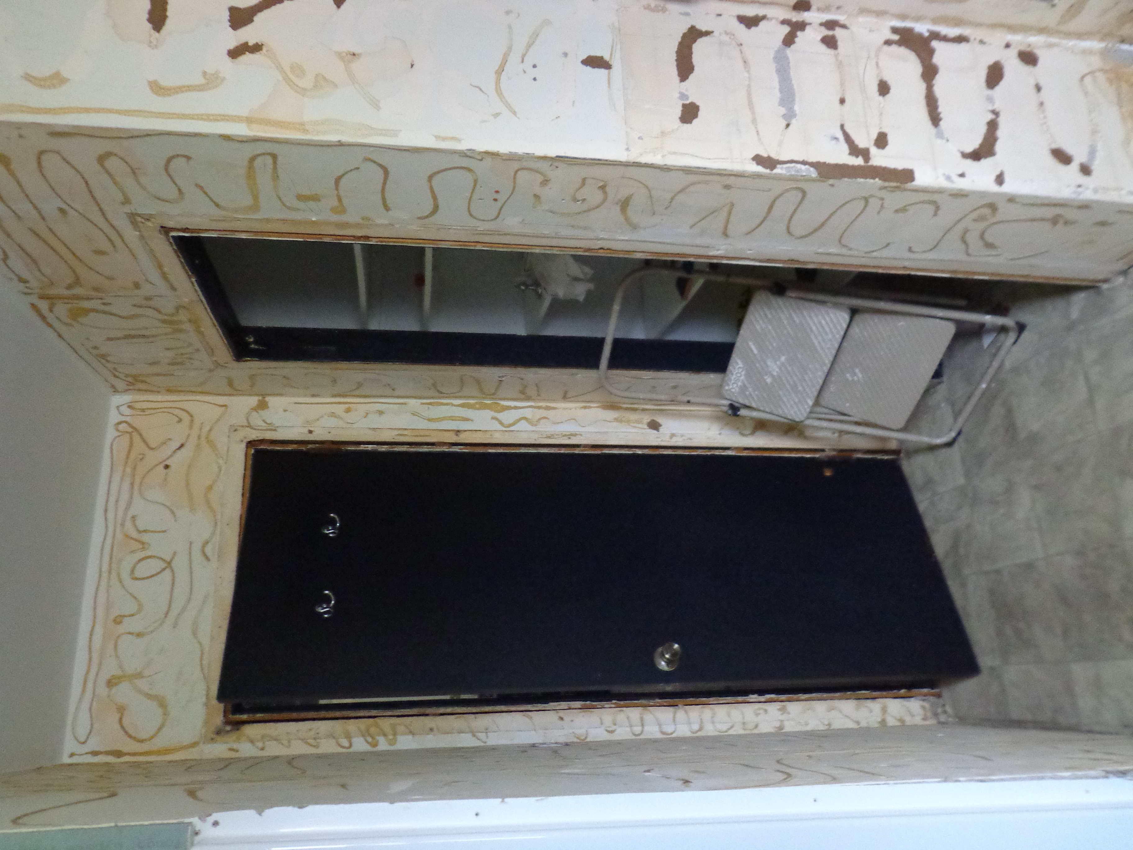 The house was built in the 1950’s so it had a cast iron tub and based on some patterns that I saw on the wall, at one time the entire bathroom had ceramic tile on the walls. That must have gone bad because it was replaced with the paneling and this horrid tub surround. Now, this particular cast iron tub didn’t have much of a lip around the edge so if you didn’t keep a decent bead of caulk where the shower surround met the tub, you would get water dripping into the basement below. Not nice. It was so old that it was getting brittle and I was unable to clean it as I wanted.
