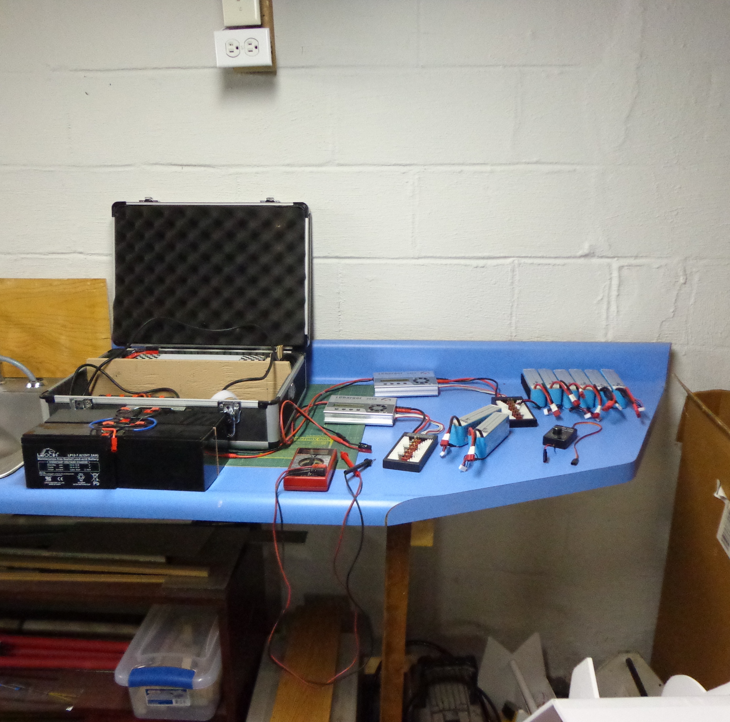 Here is the new battery charging station that he wired up. There’s a switch attached to the outlets so if something should get overheated or start on fire, you flip the switch and all power is shut off. This way you don’t have to worry about trying to pull batteries off of the charging boards. It’s quite a good idea.