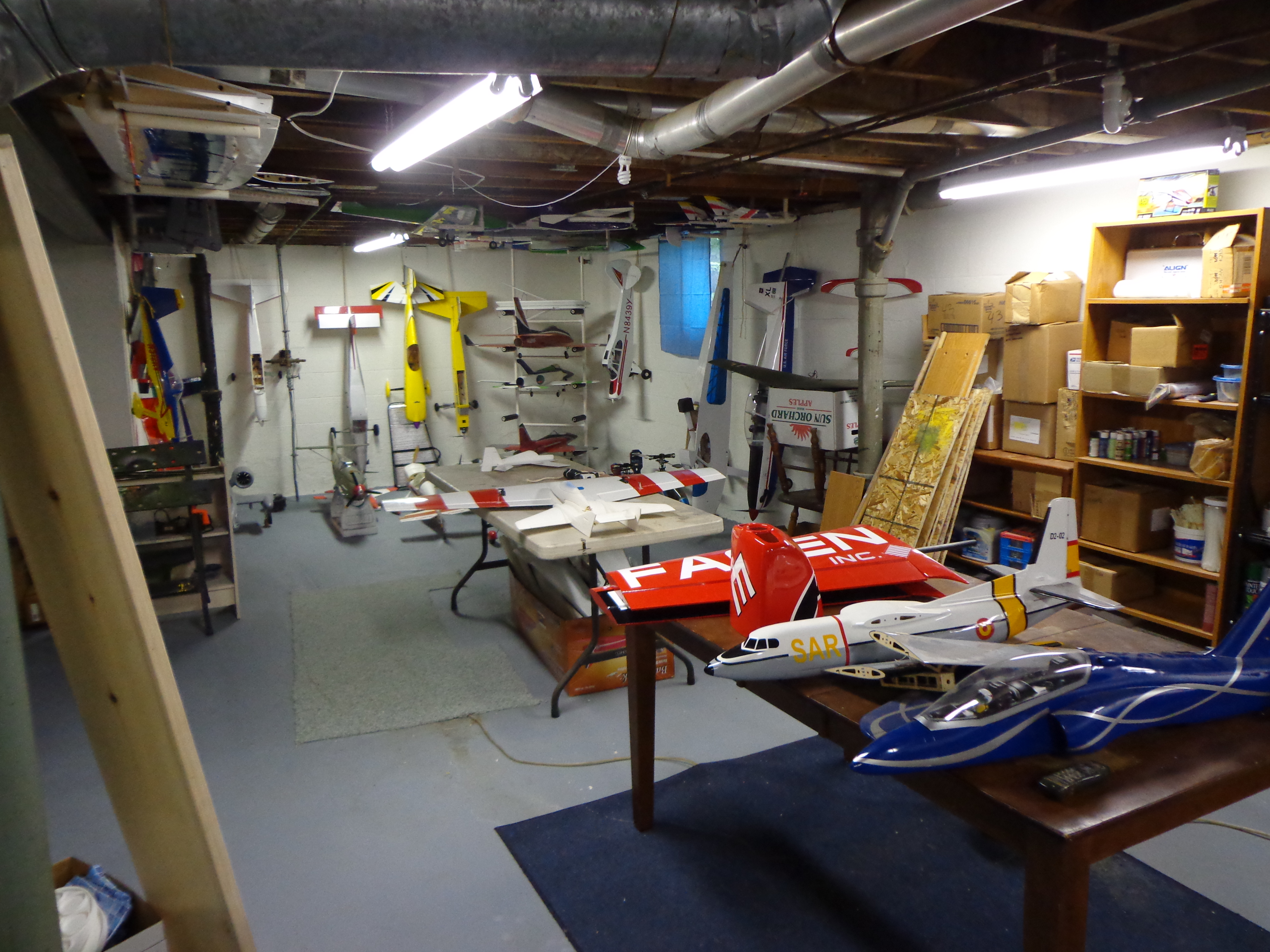 This is the hangar. He put his PVC pipe jet holder in the very corner, hung some more PVC on the floor joists to hold more jets, and found places along the wall for some of the other planes. He also has a work table set up on the rug where he can spray paint or spread out a large project for more room. It also enables him to have yet one more project in limbo without taking up space in his actual workshop.