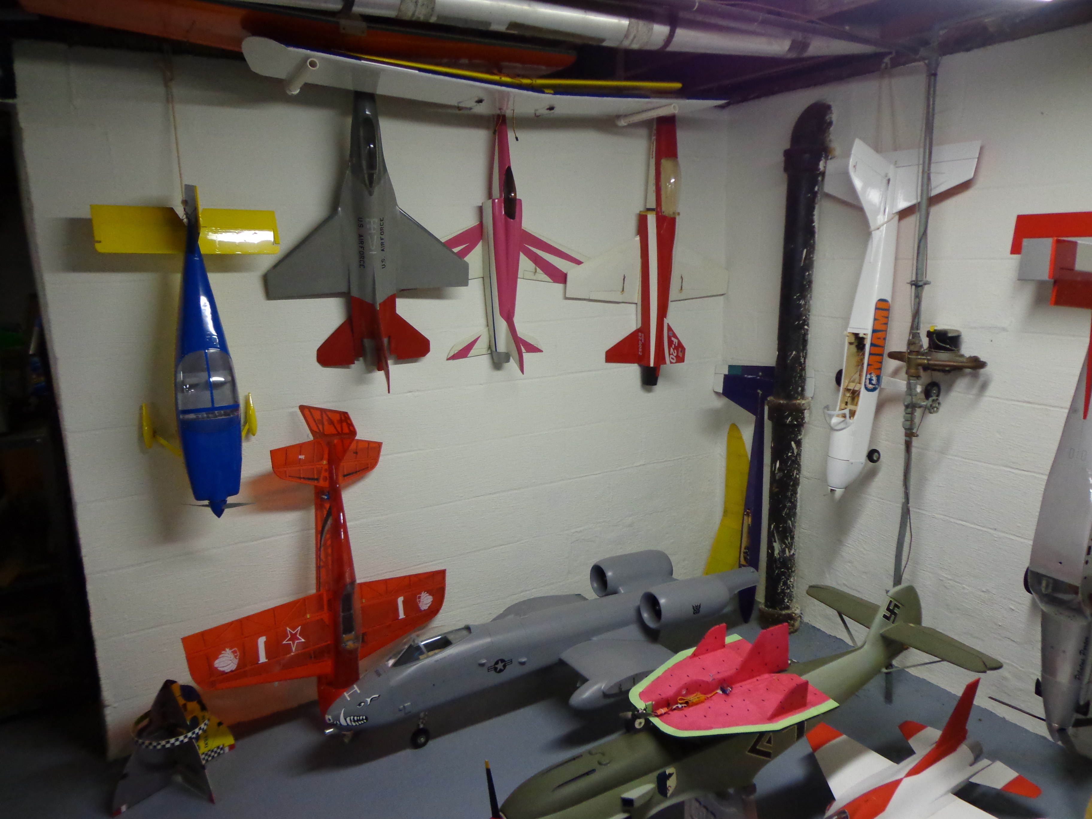There are a couple of his birds that reside on the floor, such as the A-10 and his gas-powered helicopters. Oh, and the watermelon combat foamie! You can see the one-piece wings hanging from the floor joists in this picture, too.