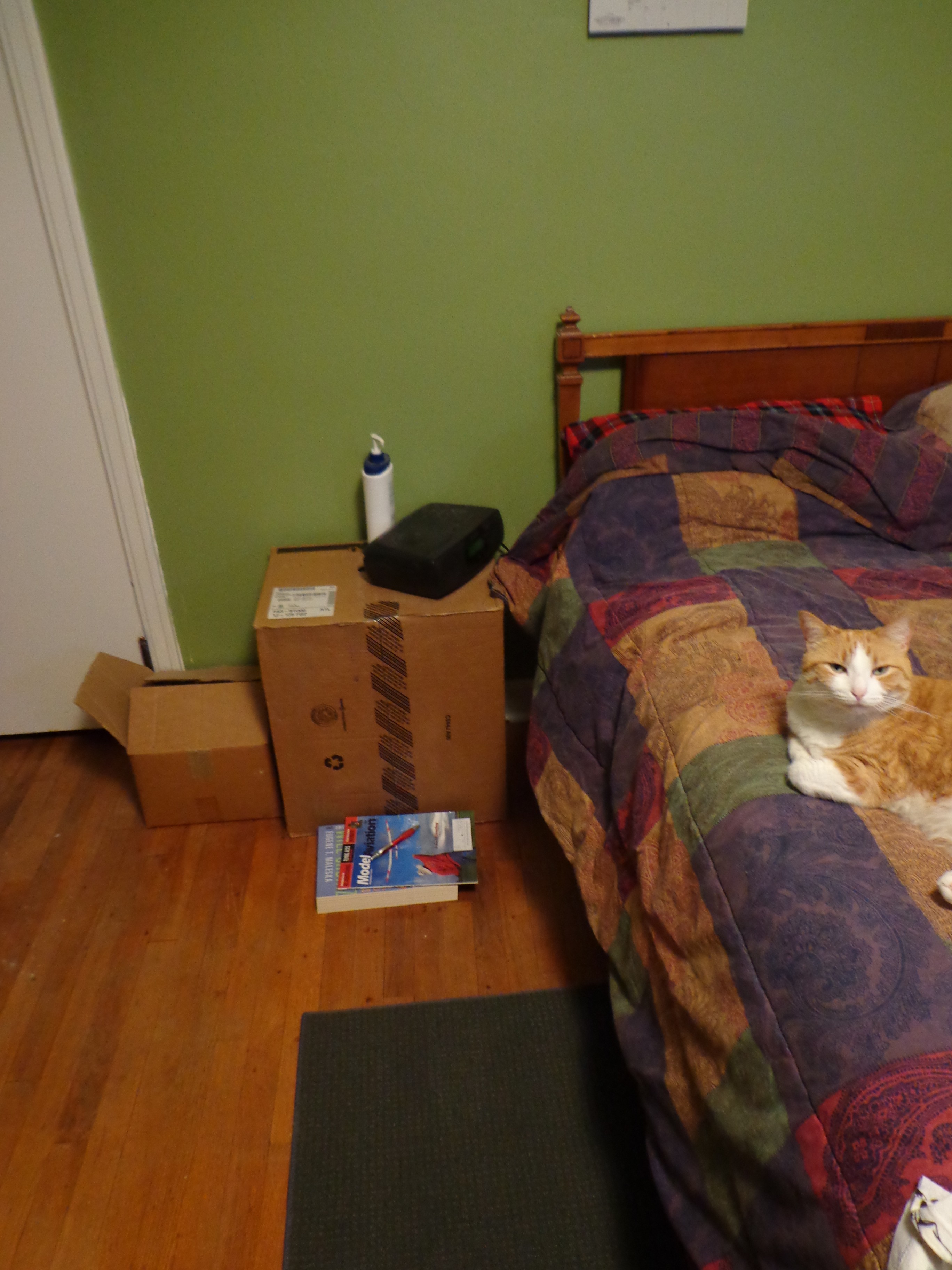 I was wrong. So, in the meantime, I used this box. It worked! All that I needed was something to hold my alarm clock, glasses, and whatever other miscellaneous things I might have. As you can see, Chester didn’t seem to mind it.