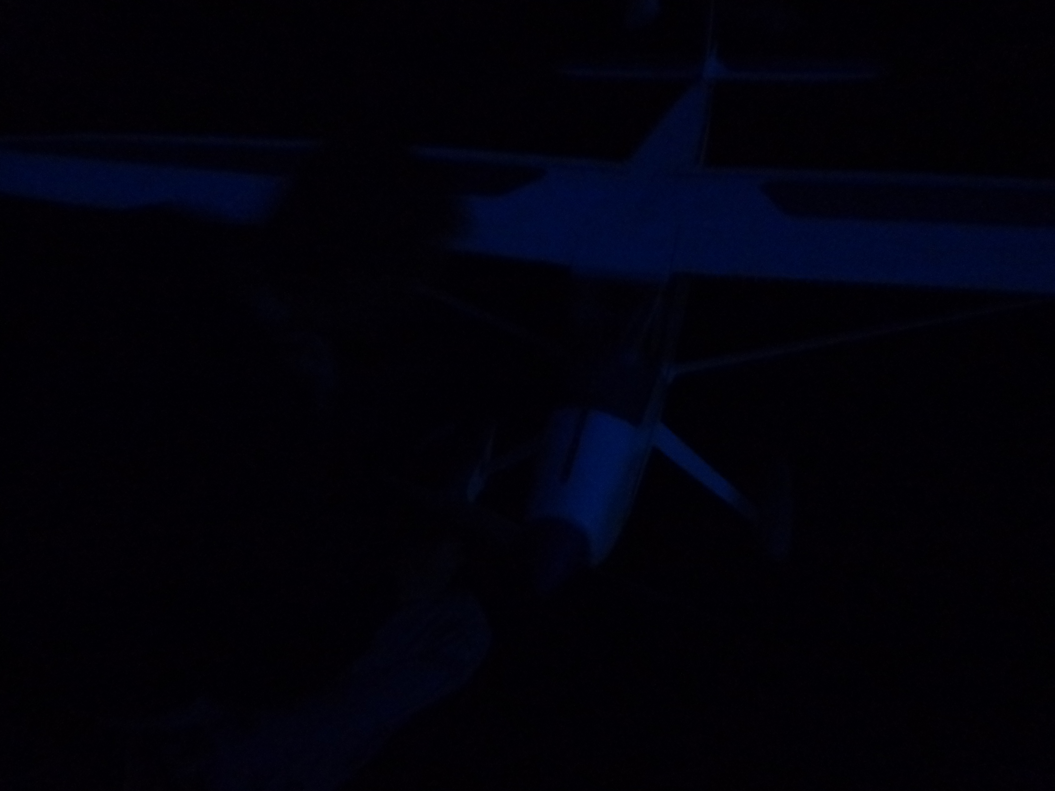 And then there was light! Jay used mostly blue LED’s, but they glowed a violet color when they were against that white covering. He also used green and white on the wing tips so that he would be able to orient himself when up in the air.