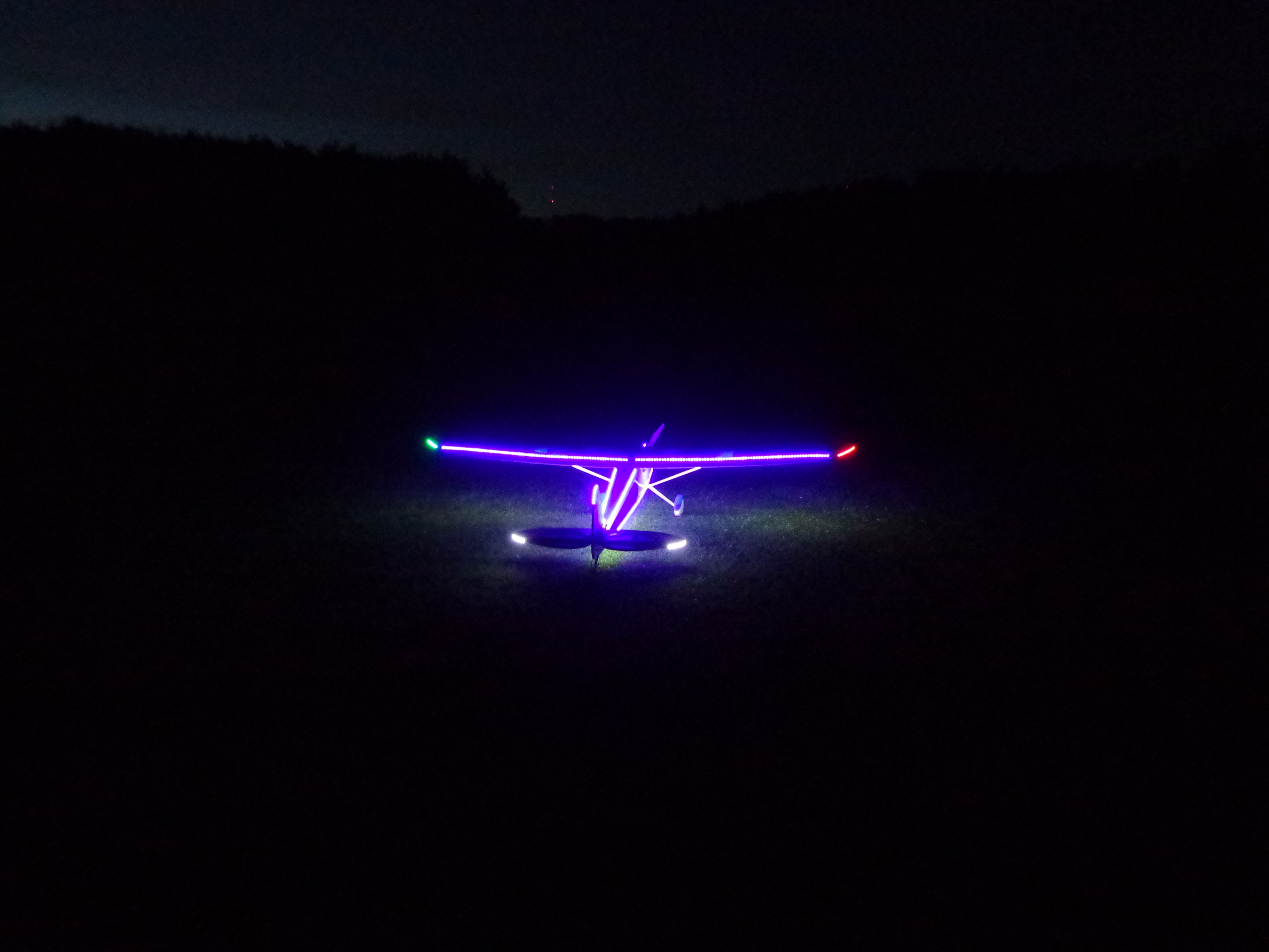 So he bought reels of LED lights that are already soldered onto the strips. All you have to do is hook them up and turn them on. He did a lot of research and ended up buying his lights off of Amazon. I can’t recall how much he paid for them, but it was a pretty good deal. He also bought a separate controller so that he could turn them on and off while in the sky. Yes… Jay likes to push the envelope and that includes flying completely dark at night. It turned out really good! These pictures aren’t the best, but you get a little bit of an idea how it looked.