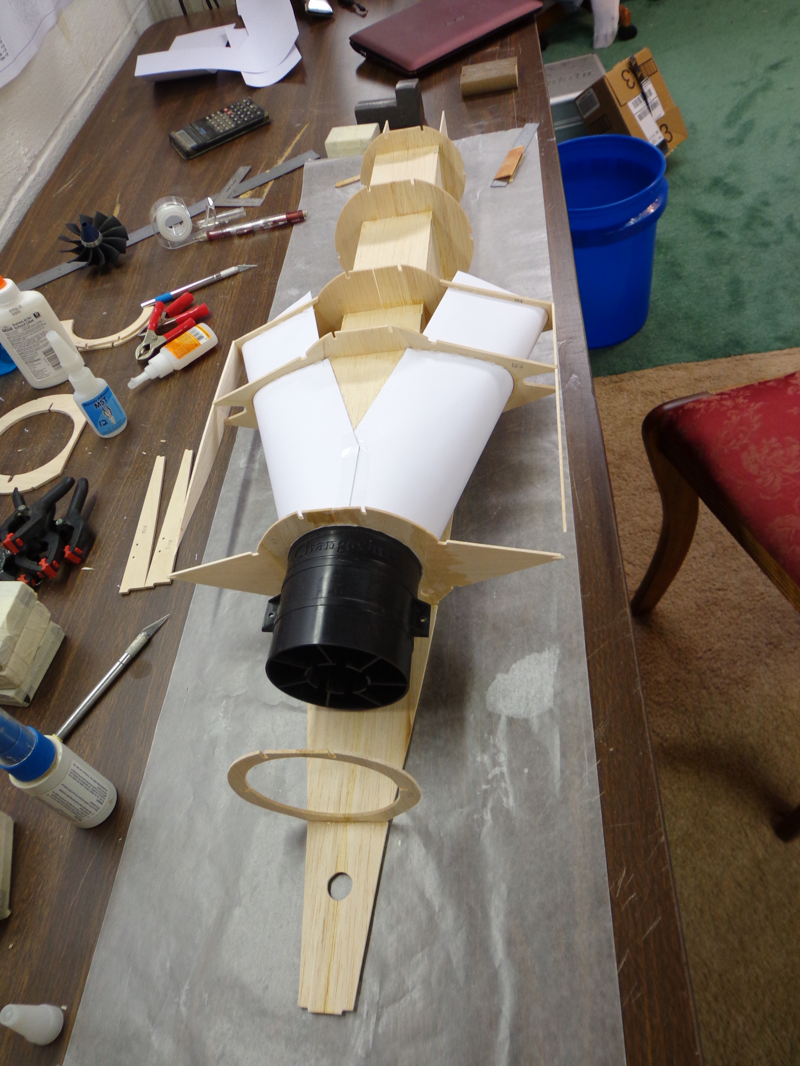 The plans have been hung on the wall in front of the building bench and the CA has been uncapped…