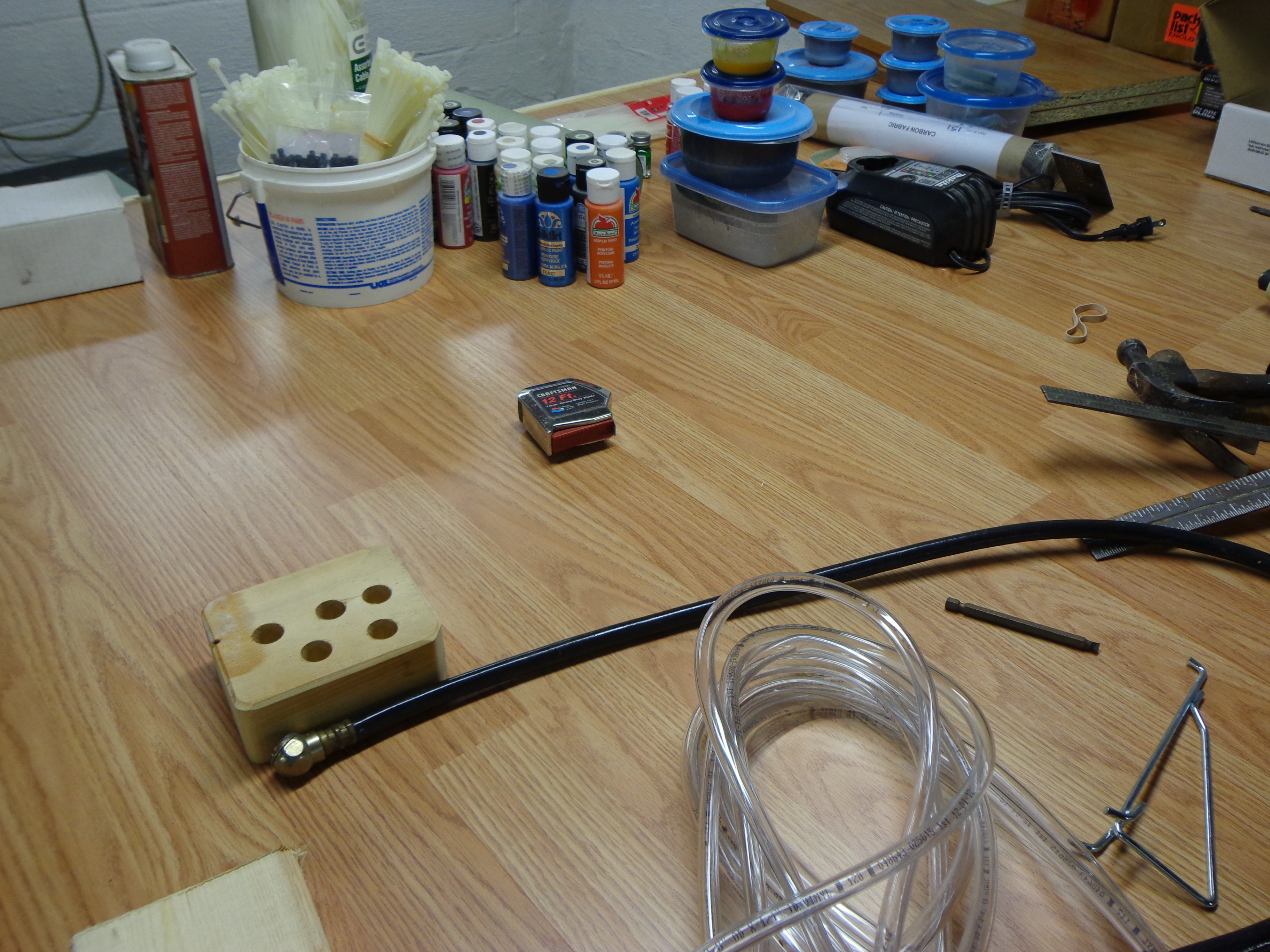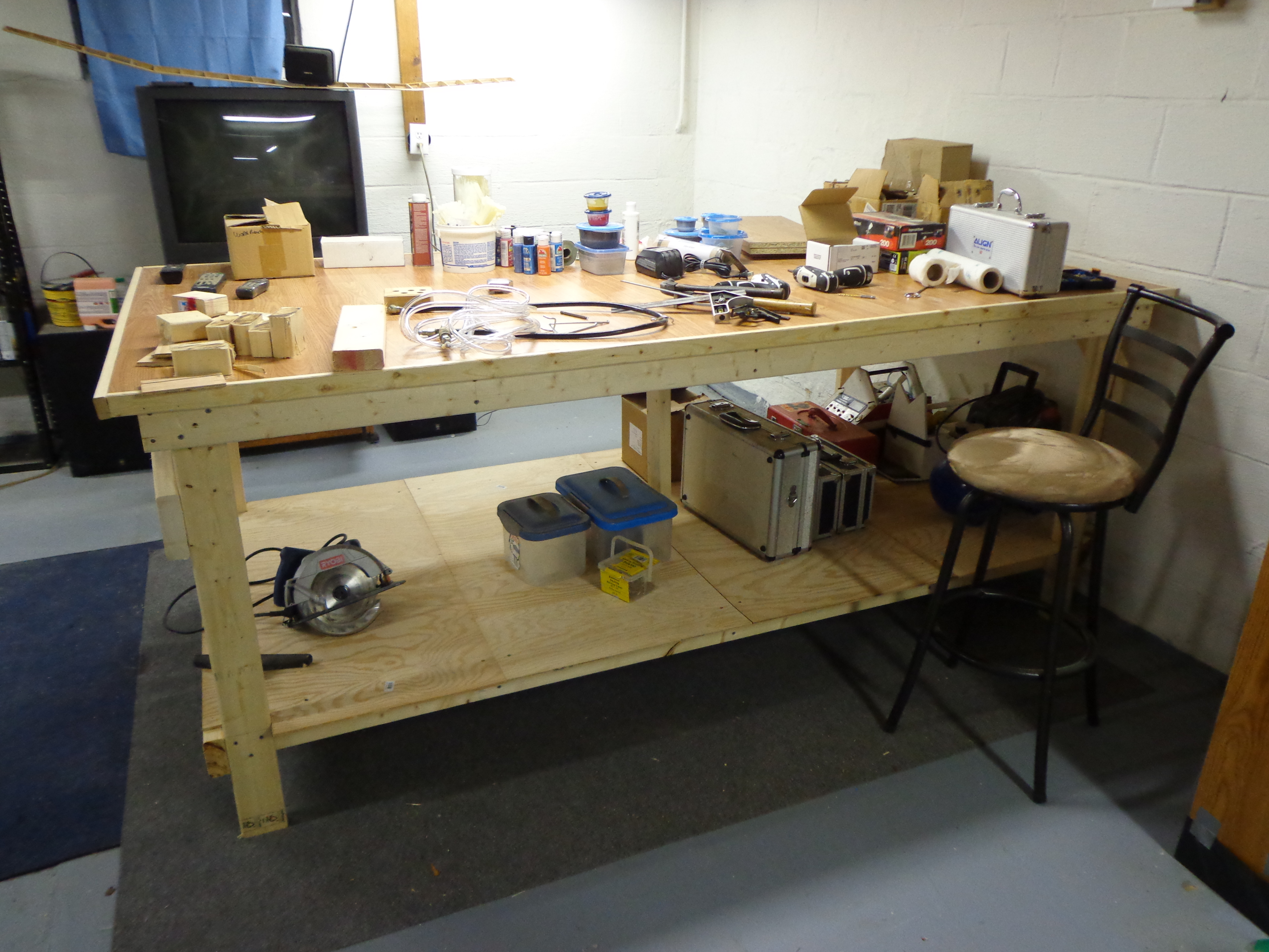 This is Jay’s design. It’s fairly simple, but will be exactly what he needs for working on the larger aircraft that he seems to be getting into. This is 4′ x 8′ and stands 40″ tall. It’s tall enough that he can use his bar stools at it, he has room for his legs underneath, and the shelf is at the right height to put his feet on. He plans to add drawers, possibly stain it, and maybe do a couple other modifications. It’s a great start, though.
