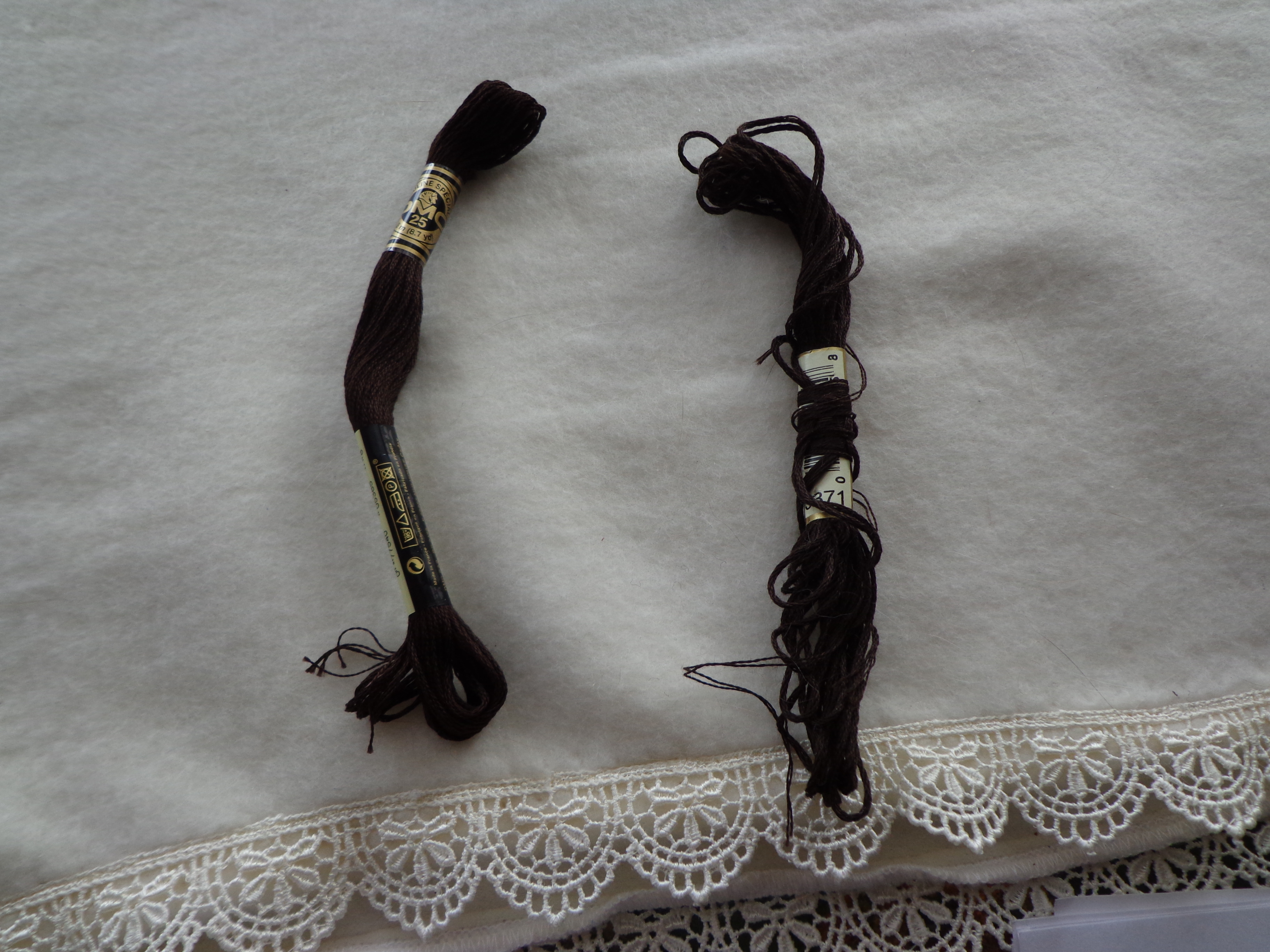 It all became clear after I finally found the skein of embroidery floss that had disappeared. The one on the right should look like the skein on the left. Why doesn’t it? Because the poor, neglected cats who live in my house have to find things to use as toys. Scraps of lace or fabric from the sewing room… the polishing wheel for Jay’s Dremel… a pony tail holder… all of these are turned into toys by cats who have nothing else with which to play…